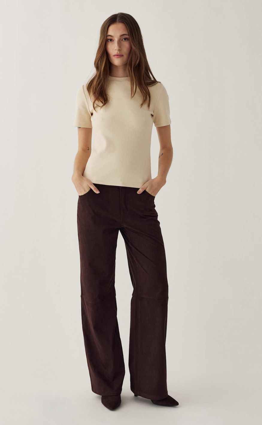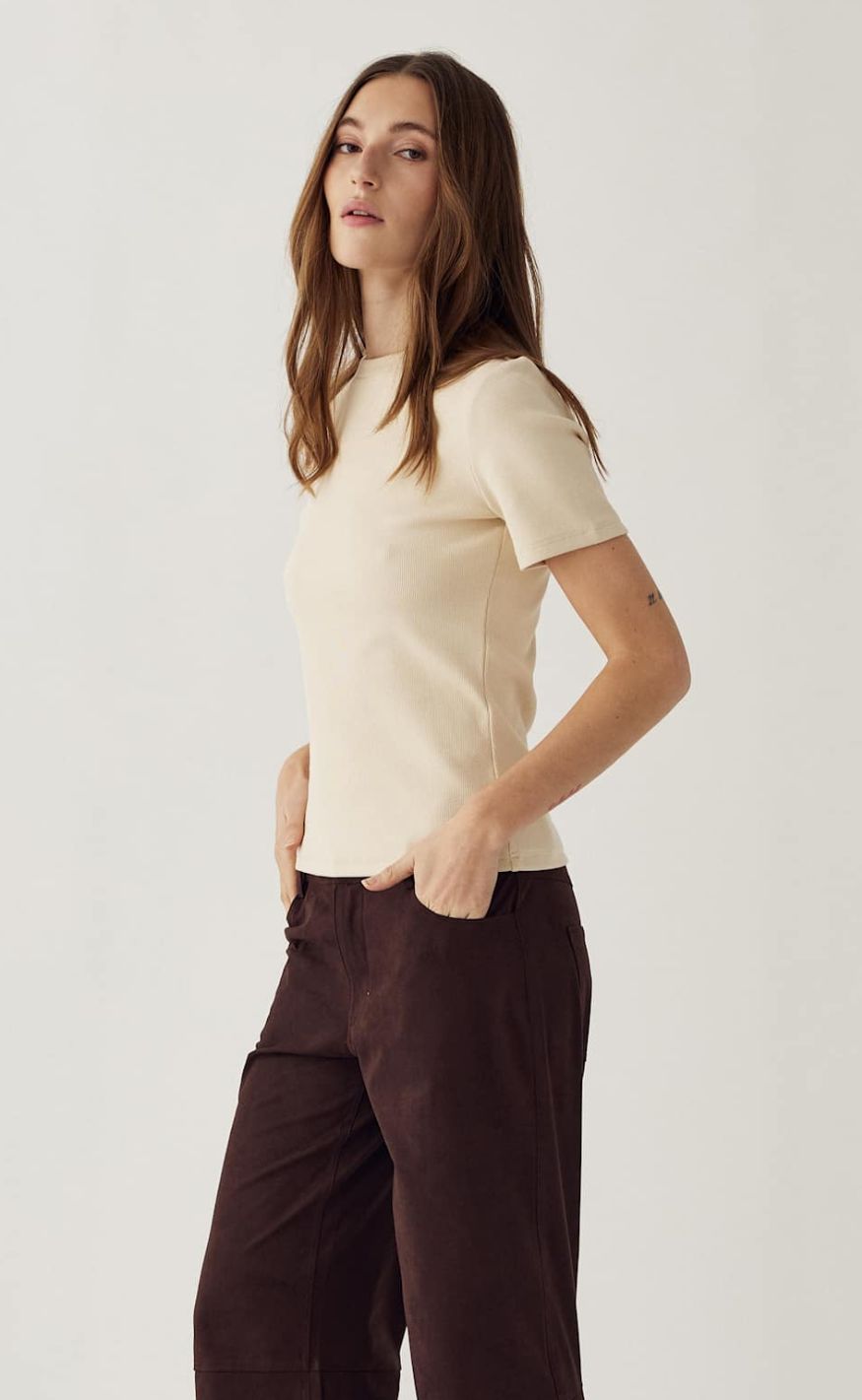 Klassisk og tidløs T-shirt i en blød, ribbet kvalitet med en behagelig pasform. T-shirten har rund halsudskæring og korte ærmer, som giver et enkelt og feminint udtryk.
