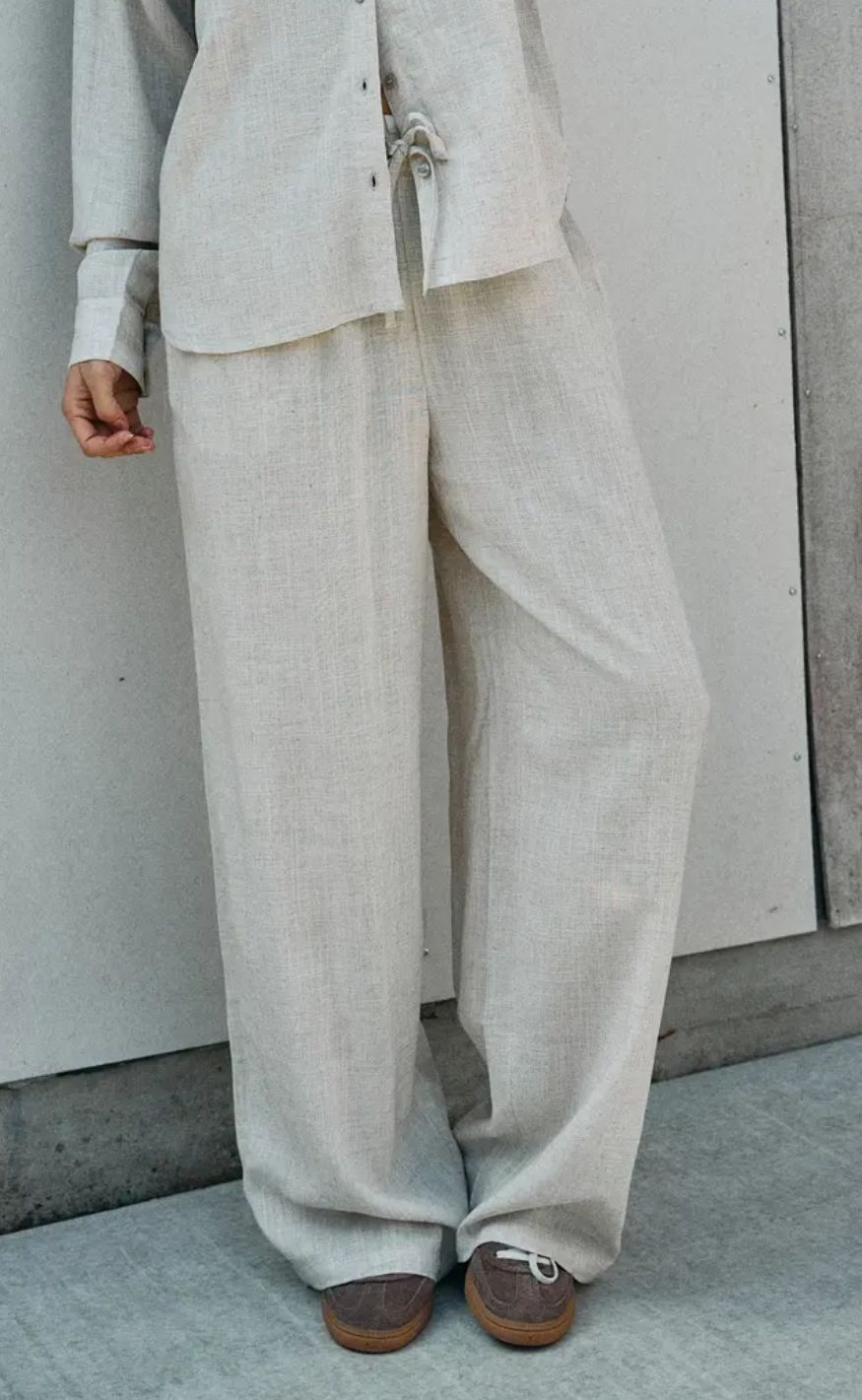 Bukserne har en straight pasform med elastik og bindebånd i taljen.