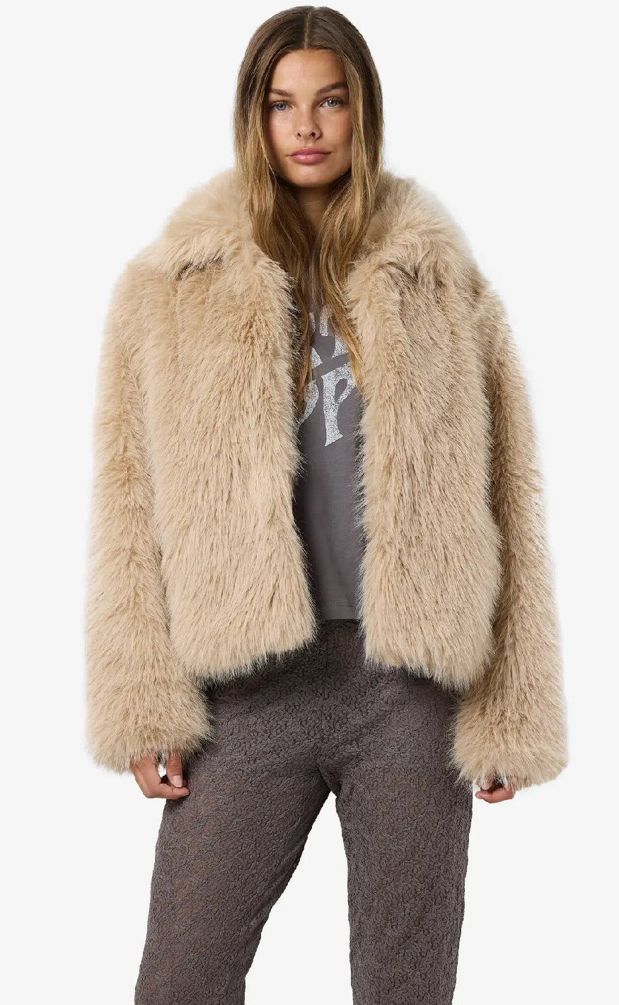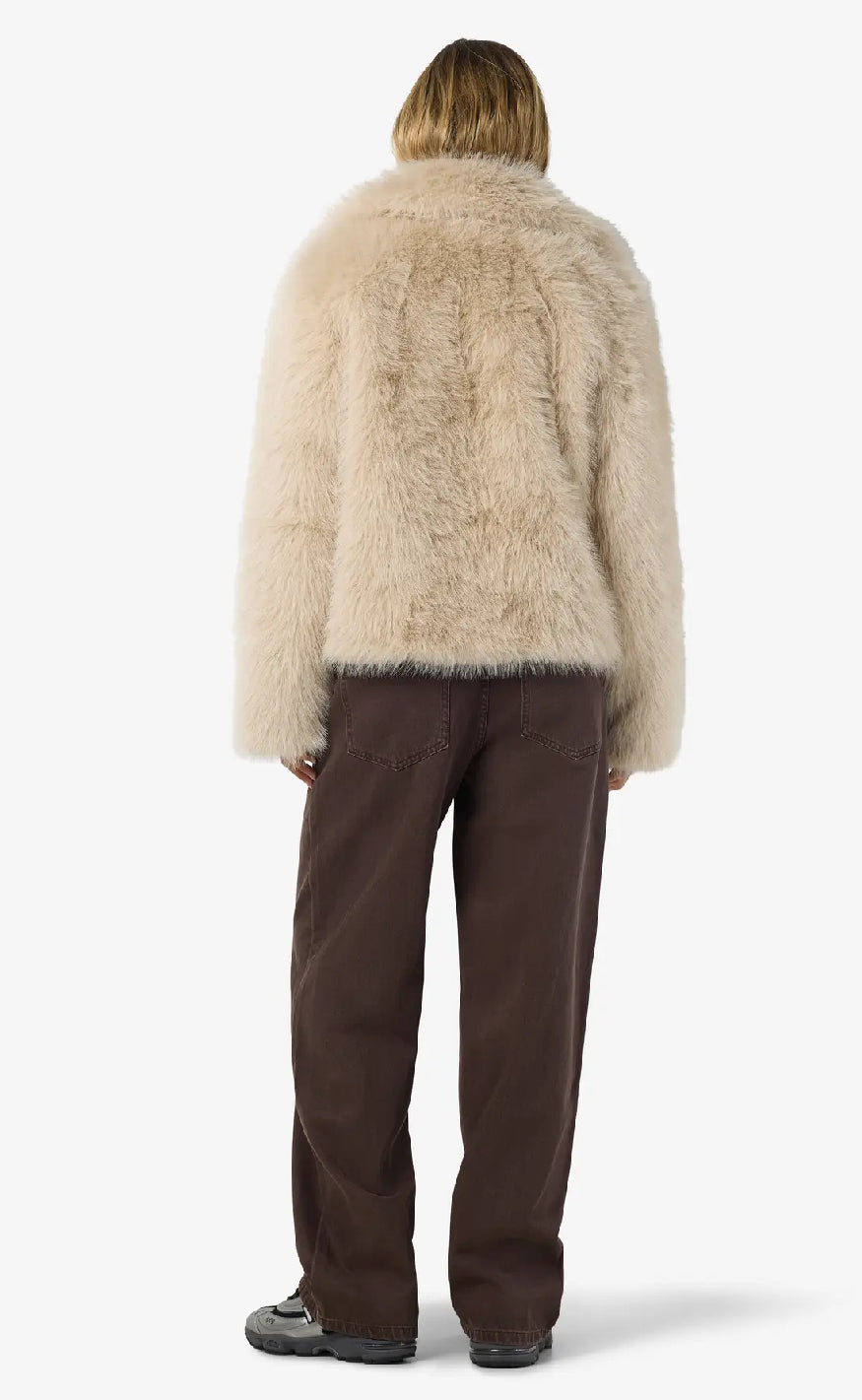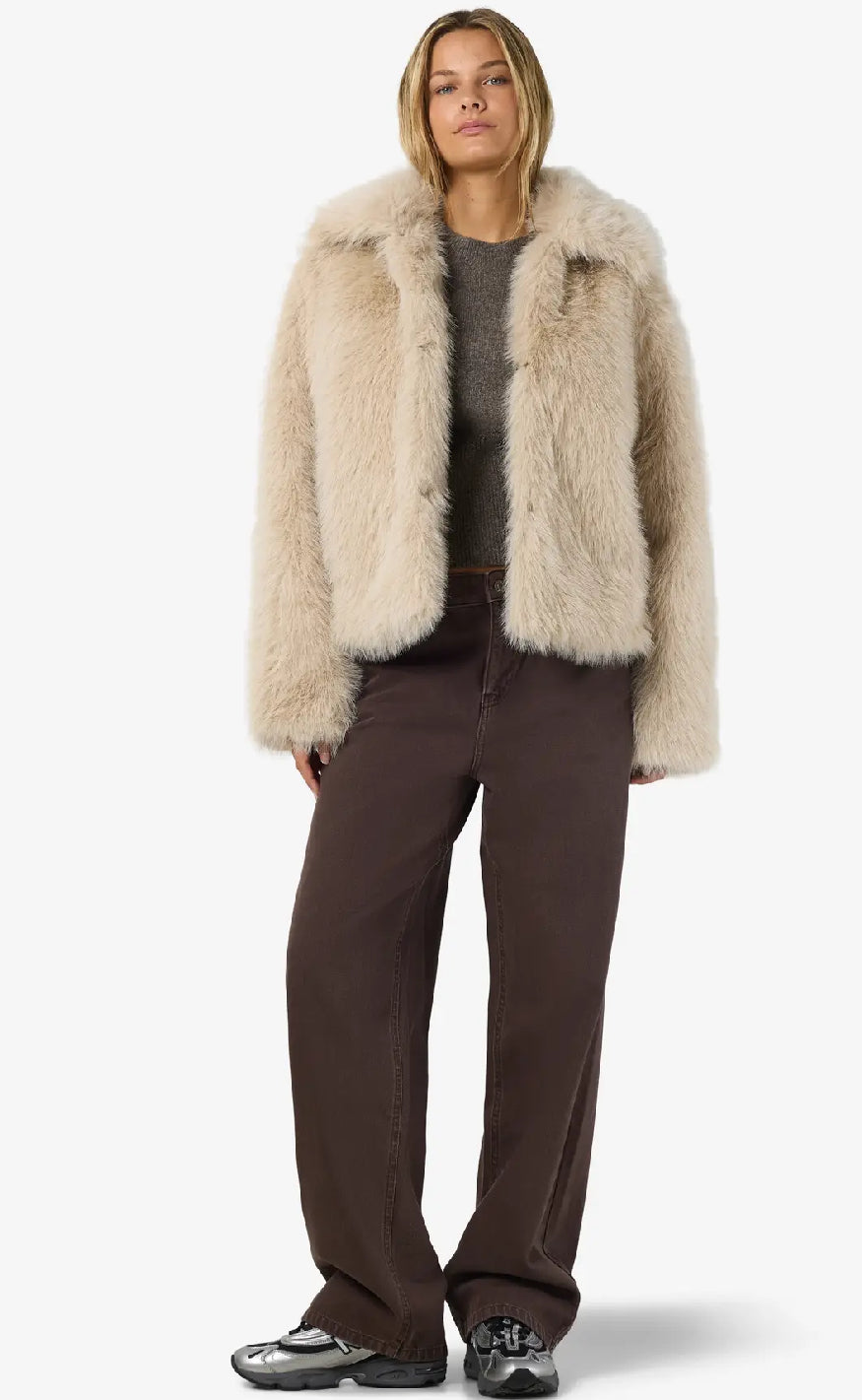 Blød og stilfuld faux fur jakke fra Noisy May i en smuk beige nuance. Jakken har en klassisk krave og lange ærmer, samt en kort, boxy pasform, der giver et moderne look.