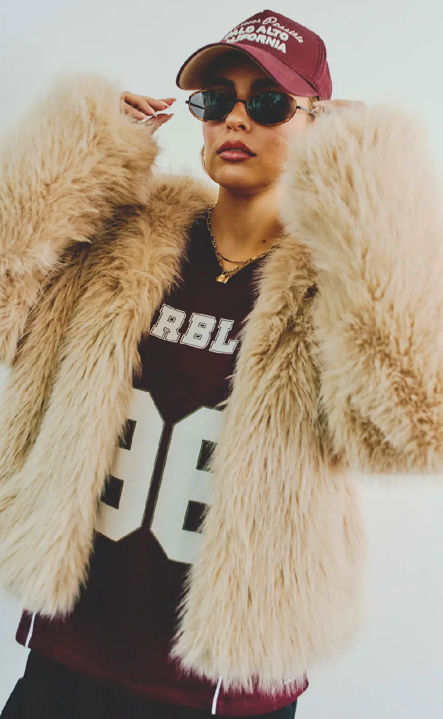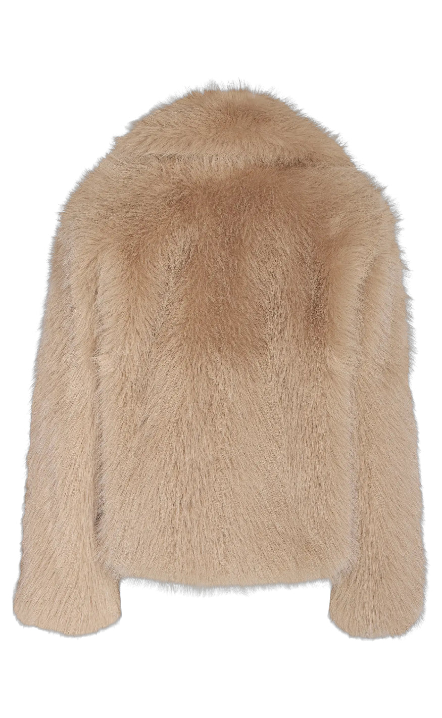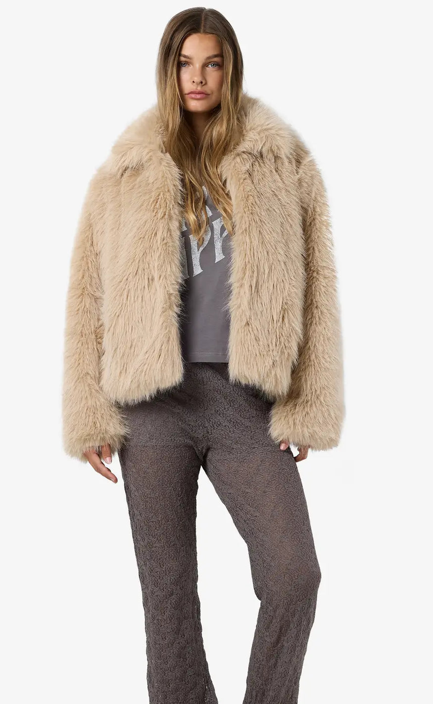 Blød og stilfuld faux fur jakke fra Noisy May i en smuk beige nuance. Jakken har en klassisk krave og lange ærmer, samt en kort, boxy pasform, der giver et moderne look.