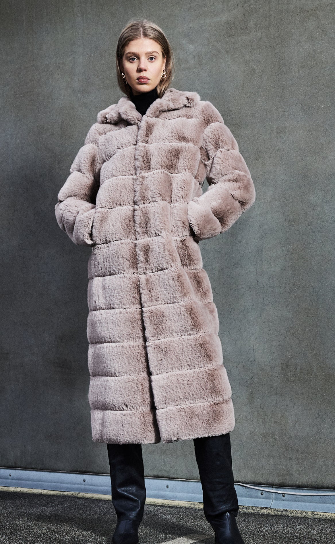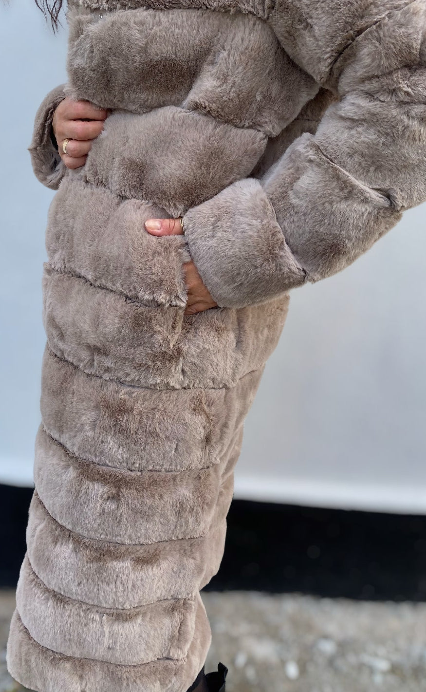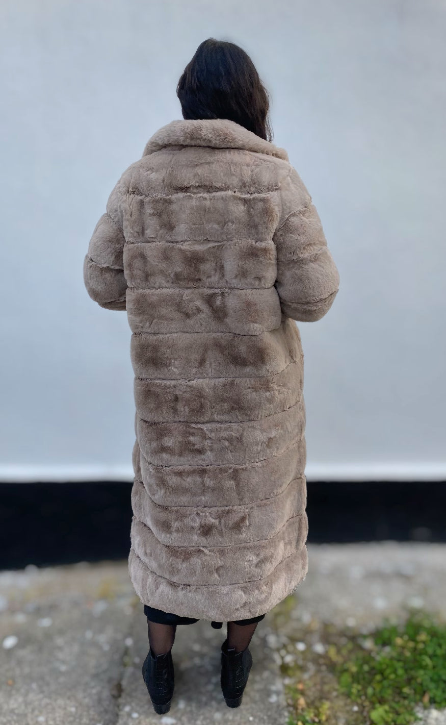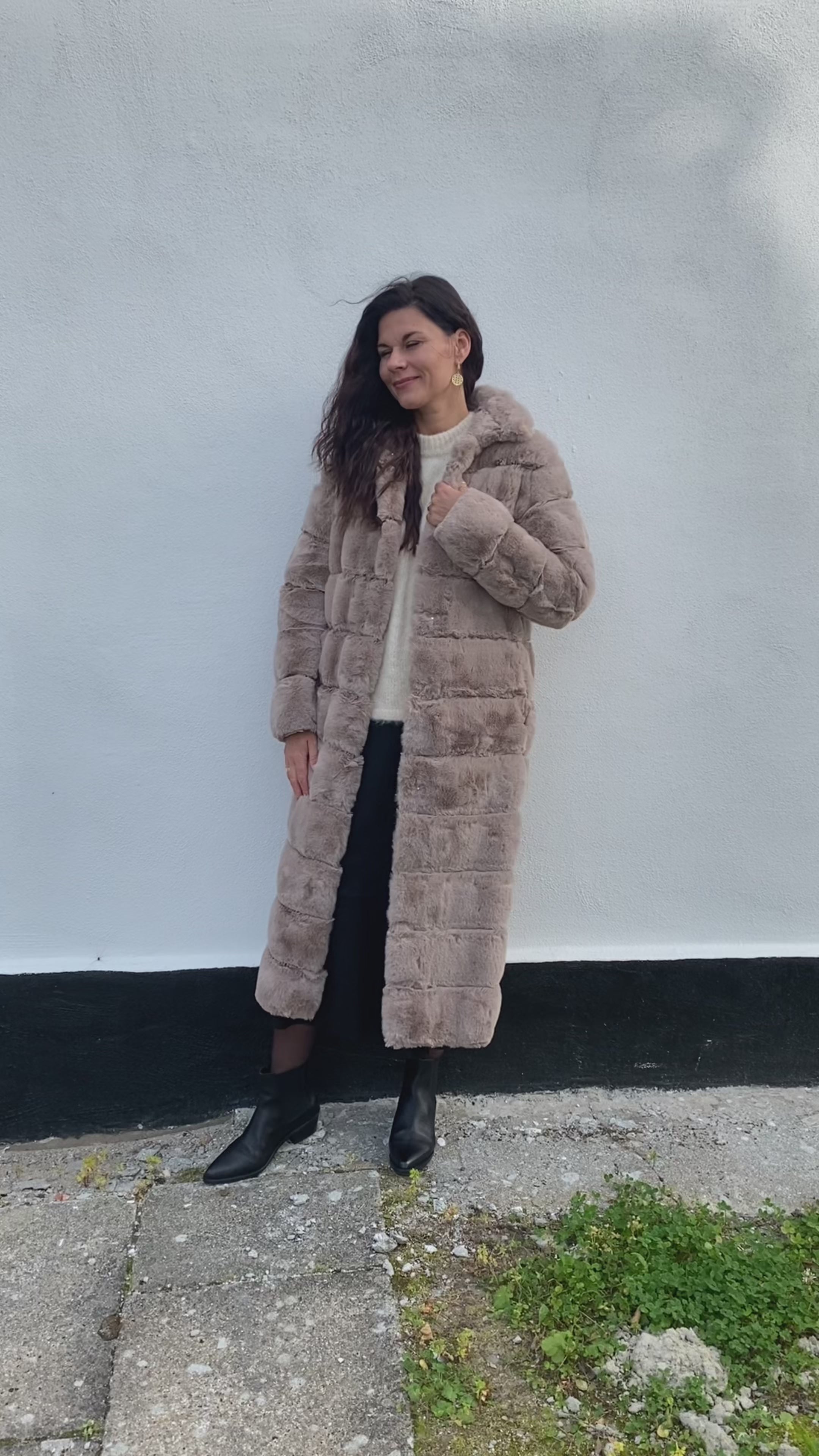 Lang frakke i blød fake pels med klassisk krave og praktiske sidelommer. Modellen lukkes med knapper foran og har et elegant, tidløst udtryk, der gør den velegnet til både hverdagsbrug og mere formelle lejligheder. En stilfuld frakke, der kombinerer varme og sofistikation – et must-have til garderoben.