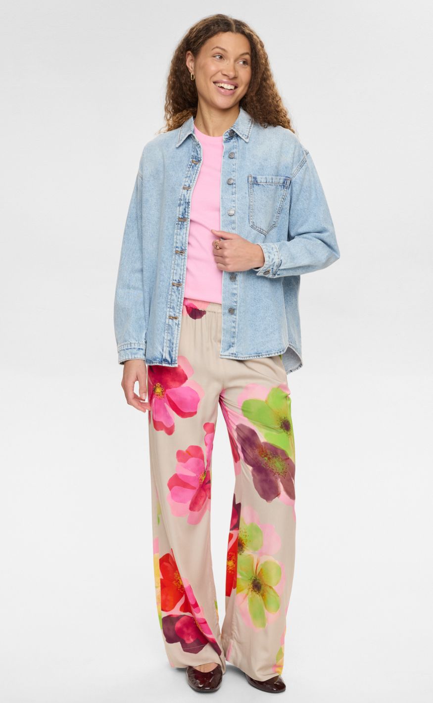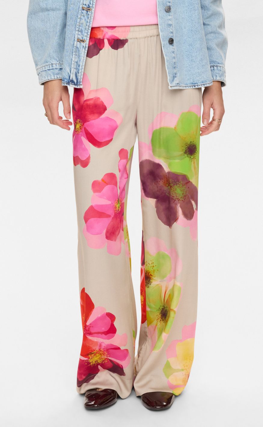 Farverige og feminine bukser fra Nümph med et smukt blomsterprint. Bukserne har elastisk talje og brede ben, som giver en behagelig pasform og et elegant, flydende udtryk.