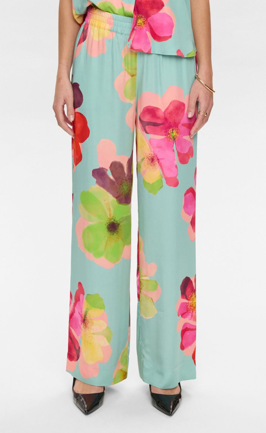 Farverige og feminine bukser fra Nümph med et smukt blomsterprint. Bukserne har elastisk talje og brede ben, som giver en behagelig pasform og et elegant, flydende udtryk.