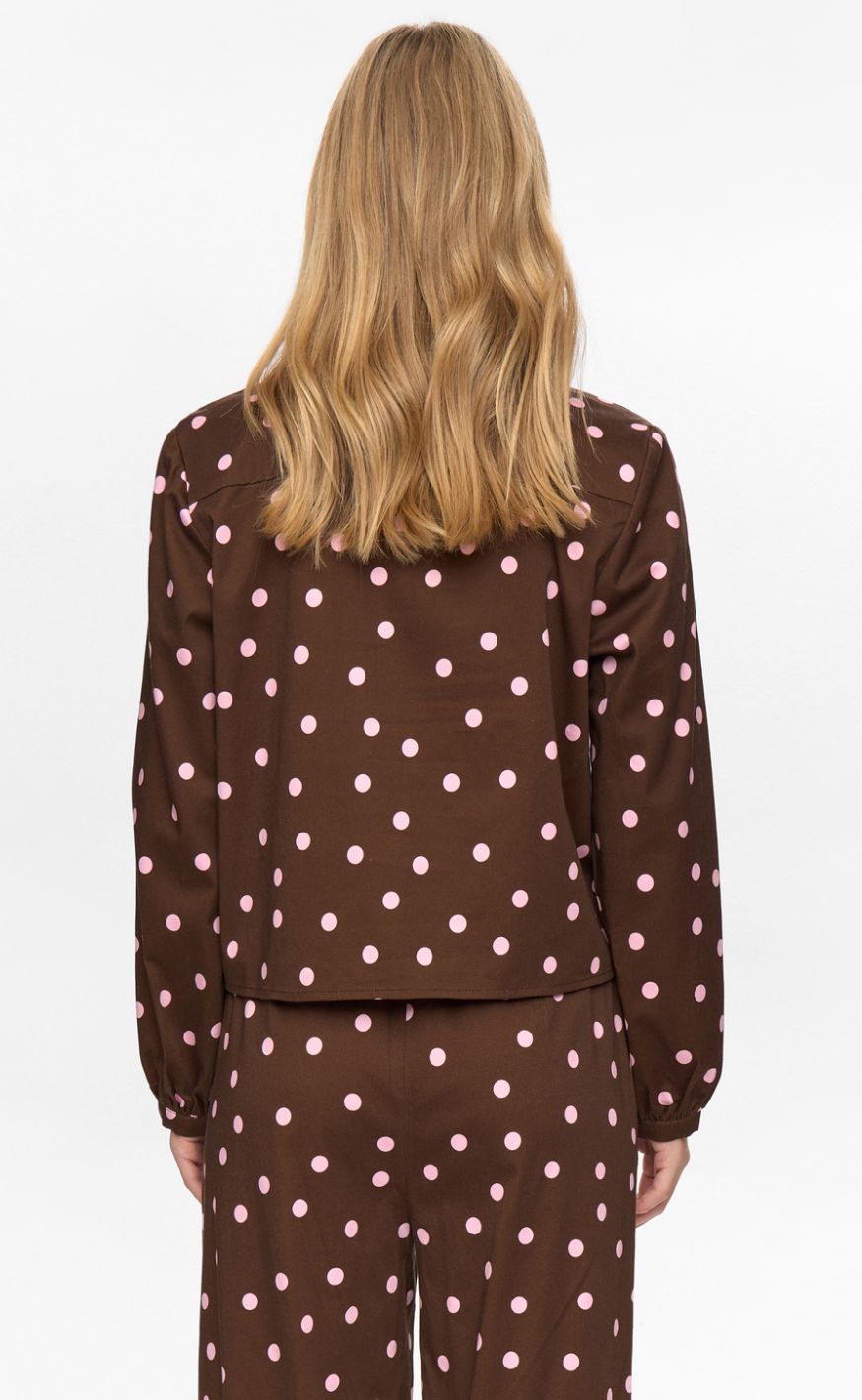 Feminin bluse fra Nümph i en smuk brun nuance med lyserøde prikker. Blusen har V-udskæring og fine bindedetaljer foran, som giver et elegant og let udtryk.