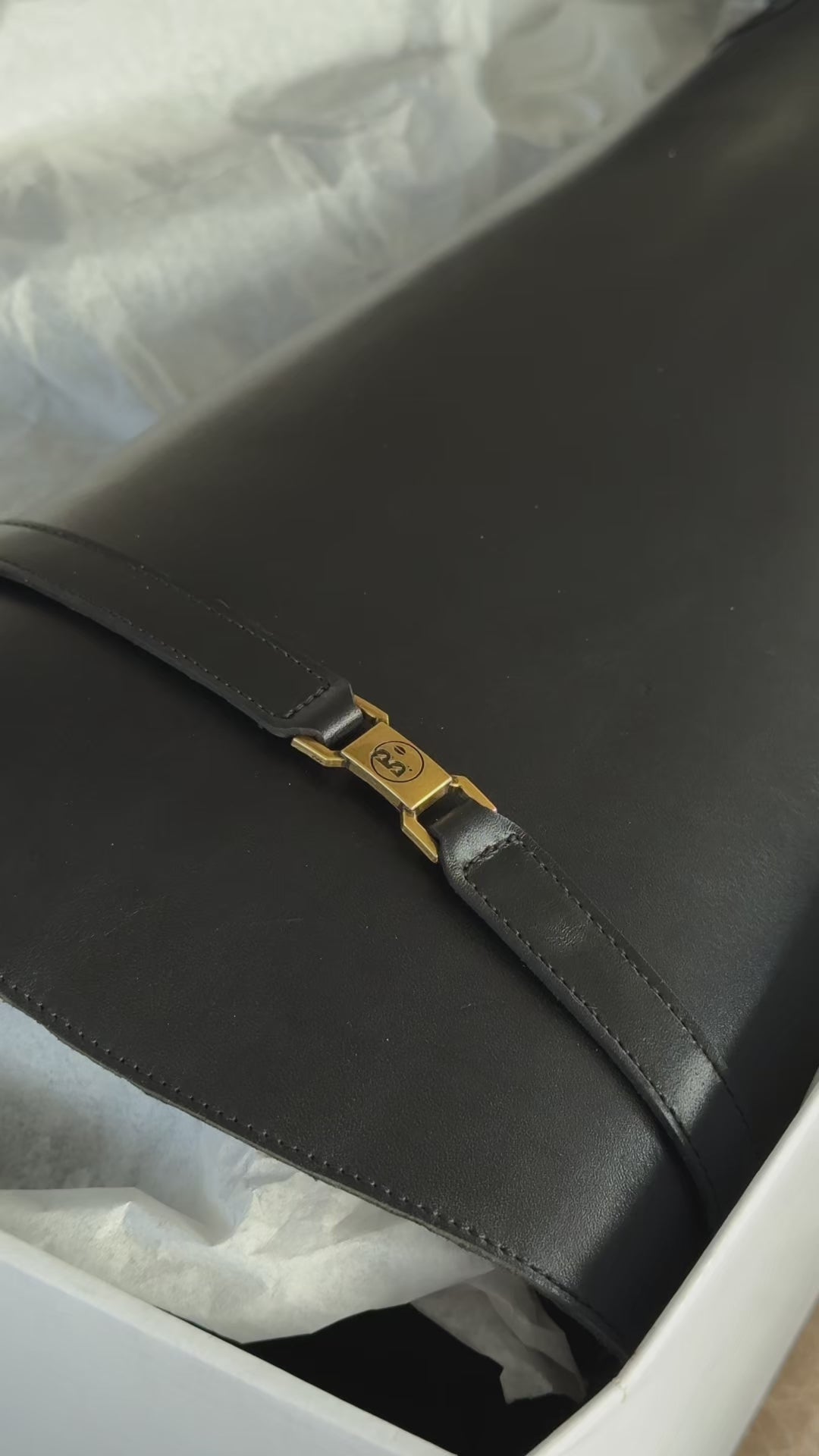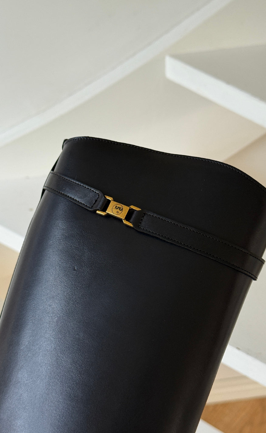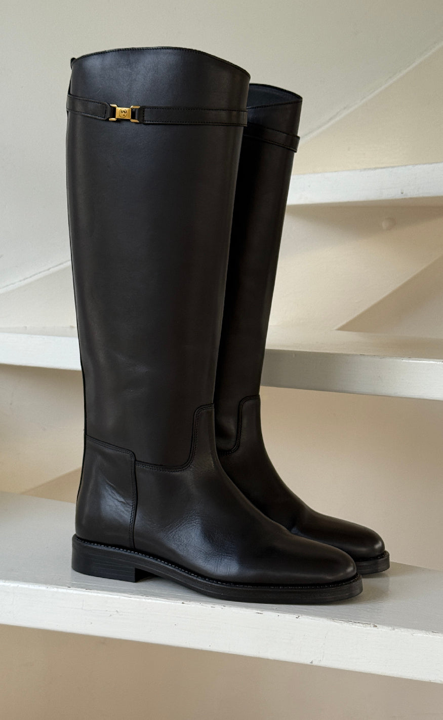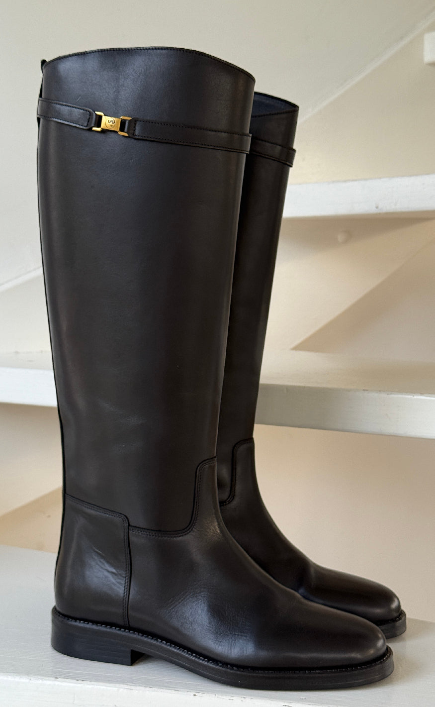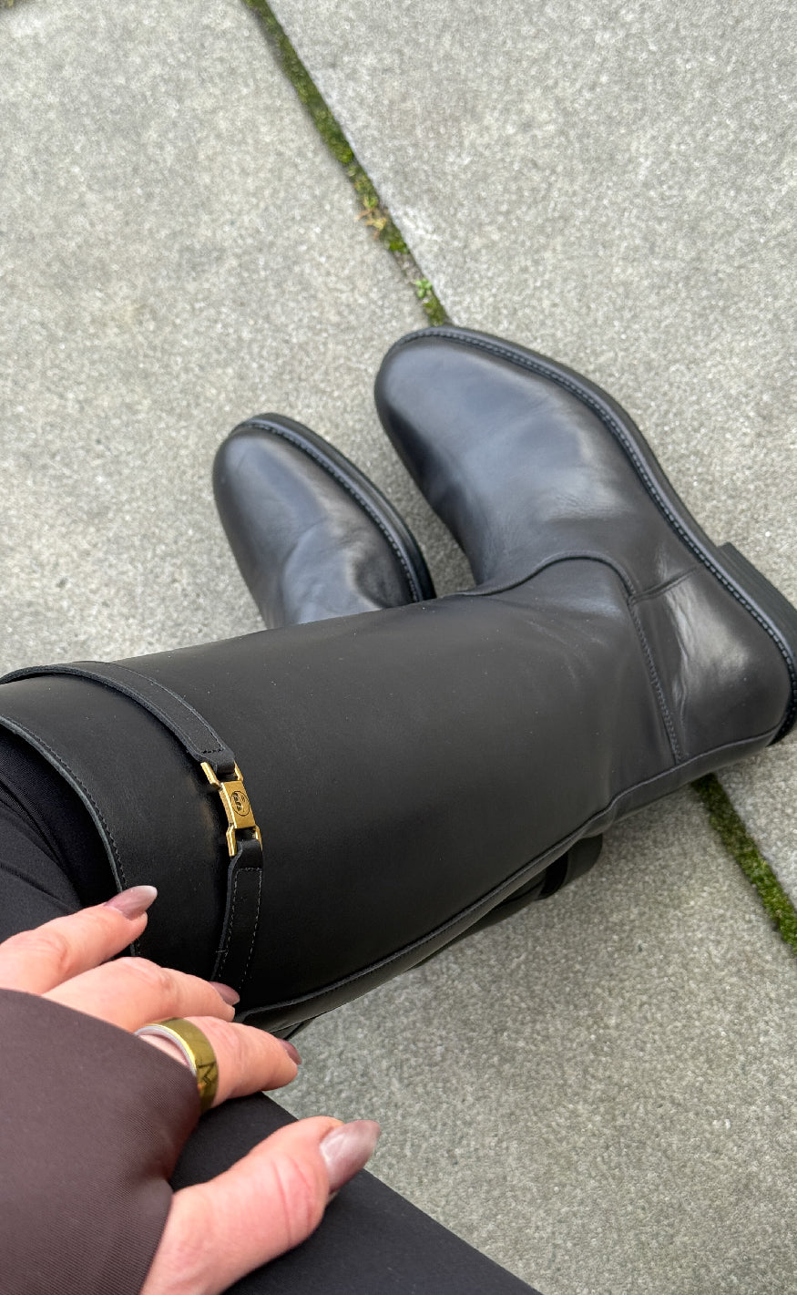 Støvlerne har rund snude, lav hæl og en dekorativ spænde øverst på skaftet.