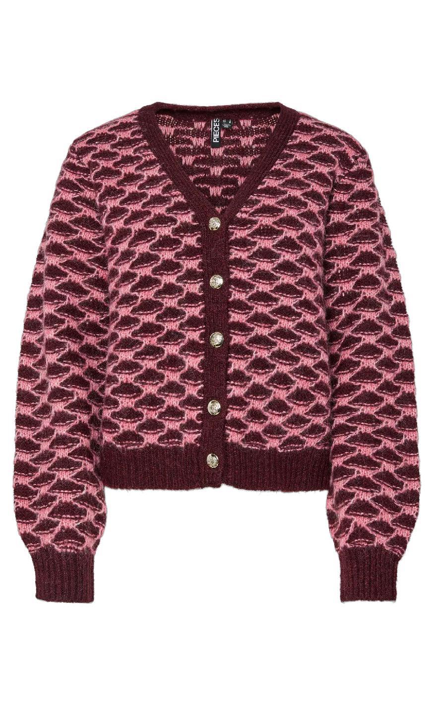 Farverig og hyggelig cardigan fra Pieces med et iøjnefaldende mønster i rosa og bordeaux nuancer.
