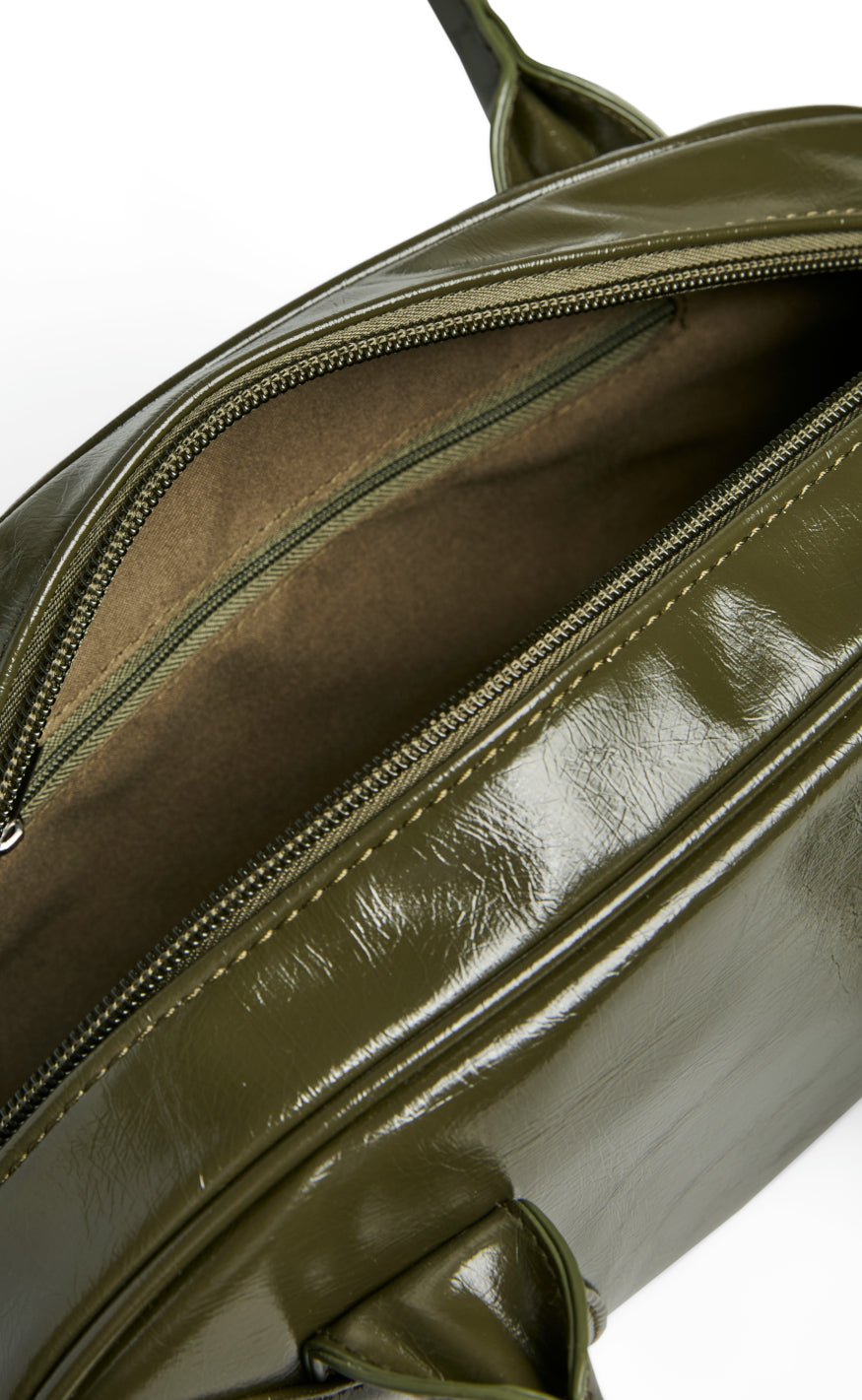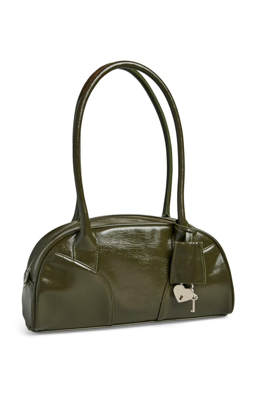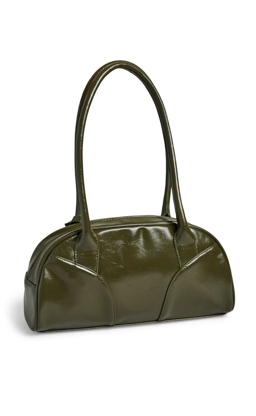 Håndtaske fra Pieces i en blank olivengrøn farve.