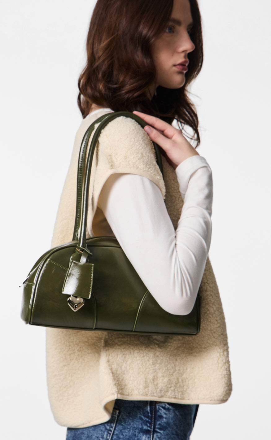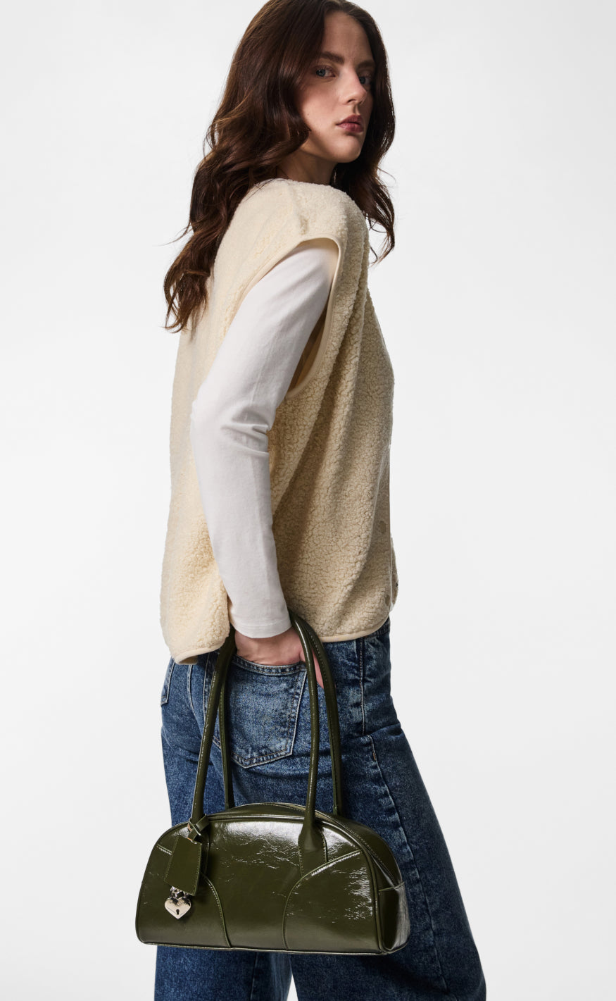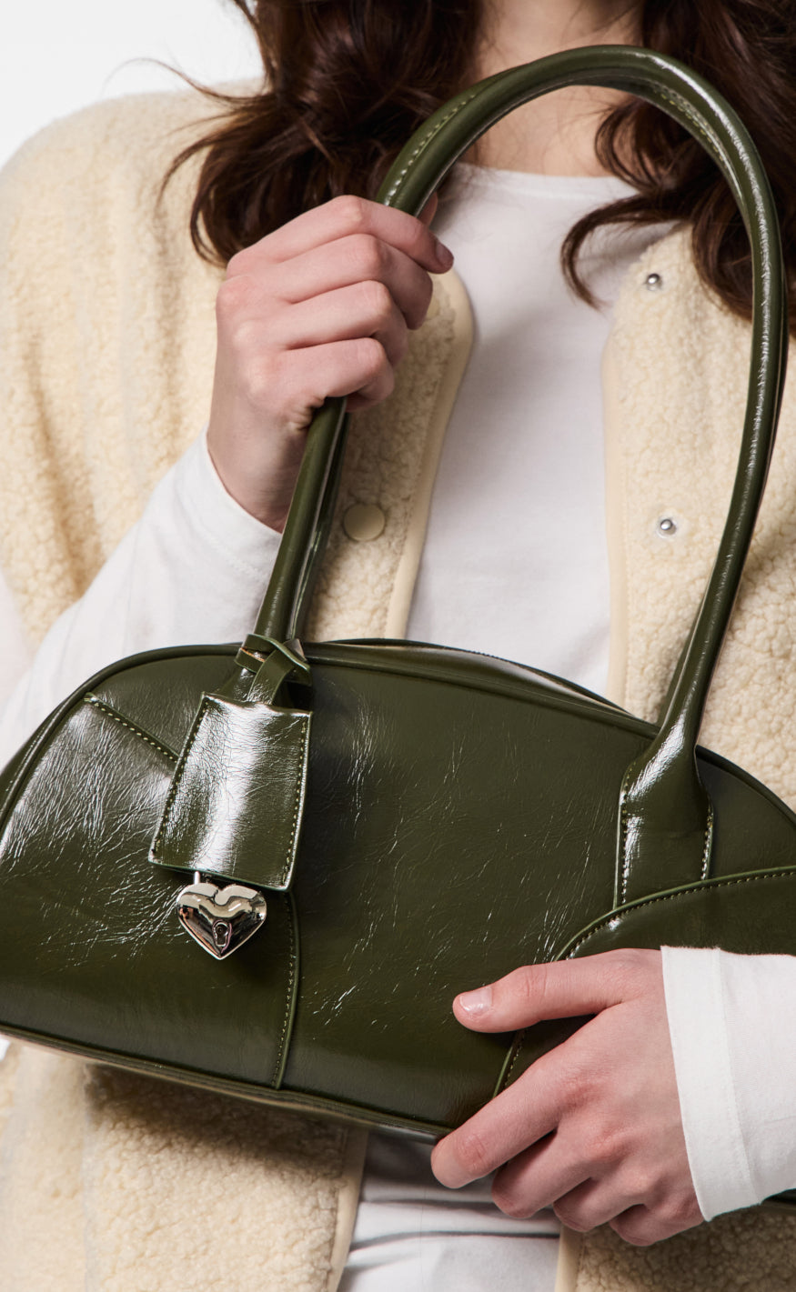 Håndtaske fra Pieces i en blank olivengrøn farve.