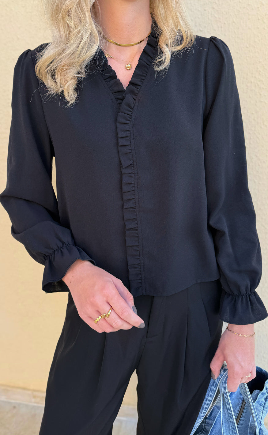 Blusen lange ærmer og har de flotteste flæse-detaljer både fortil og ved håndled.