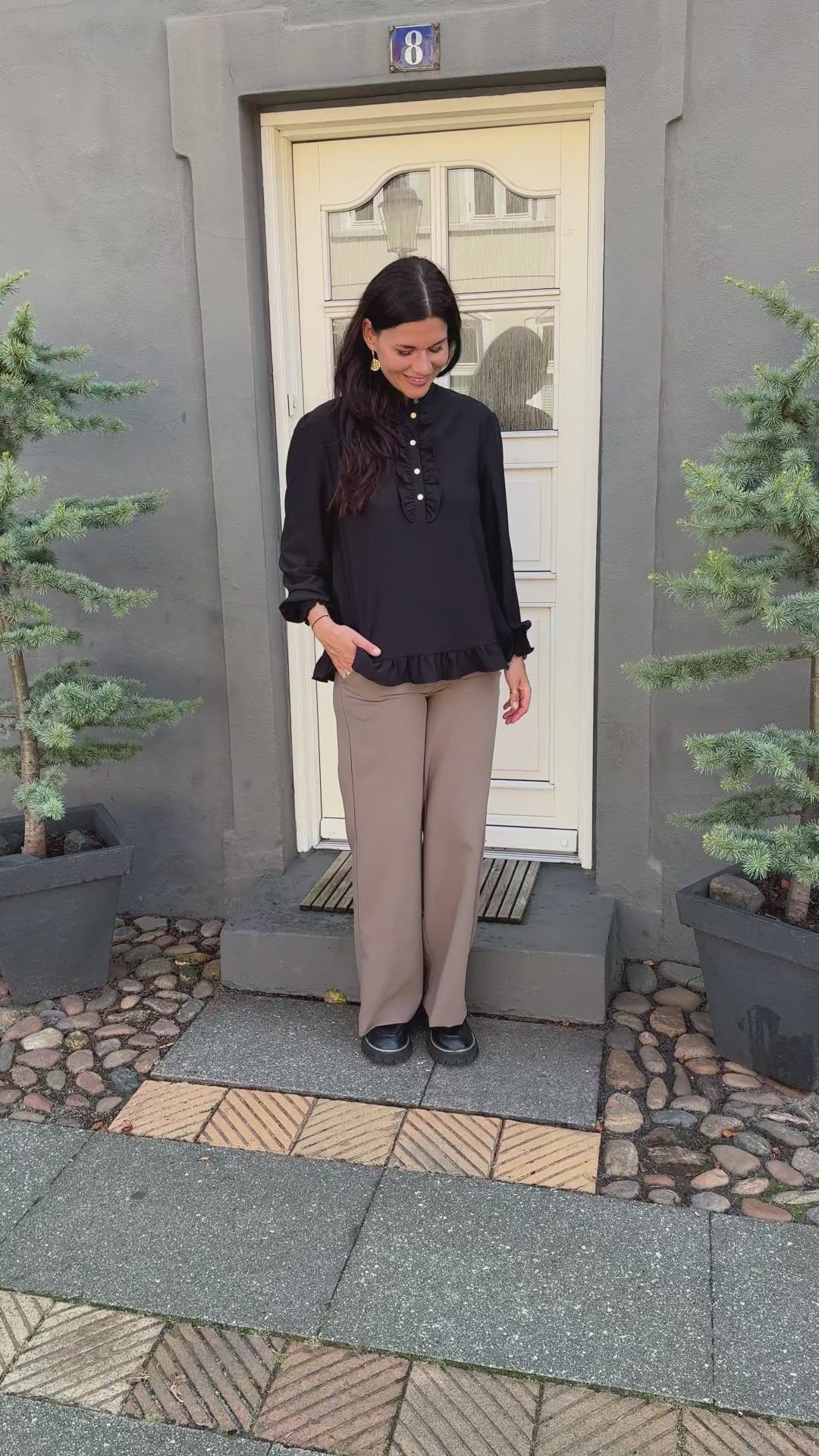 Blusen har den fineste åbning med guld knapper og flæser på fronten. Blusen har lange ærmer med smock i enden, så de kan trækkes op efter ønske. Der er en fin flæse-detalje i bunden af blusen.