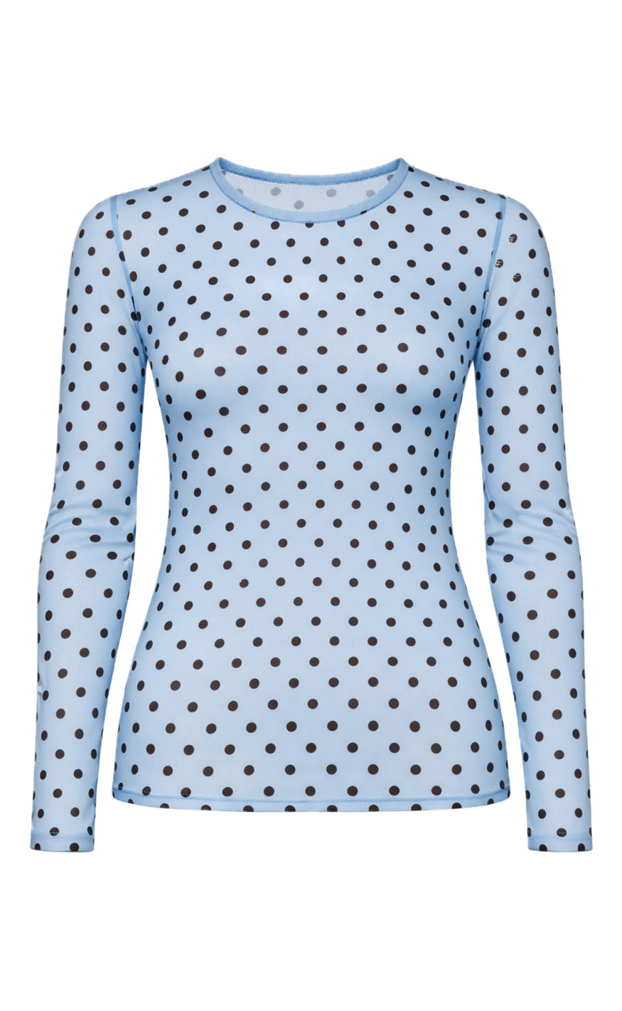 Flot og smart mesh bluse fra Say INA Copenhagen i lyseblå med sorte prikker.