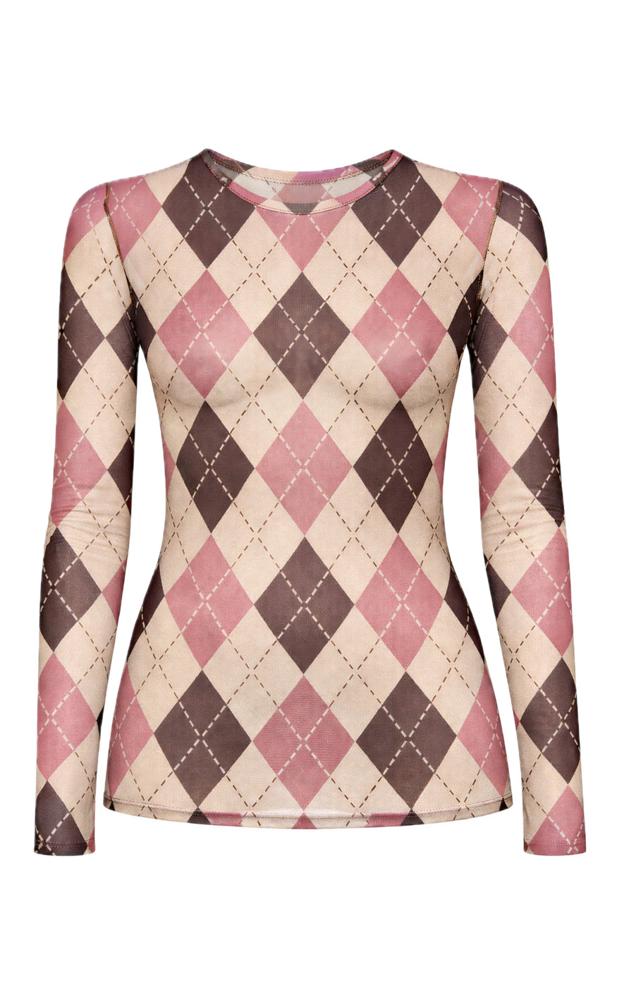 Flot og smart mesh bluse fra Say INA Copenhagen med harlekin print i pink, brun og beige.