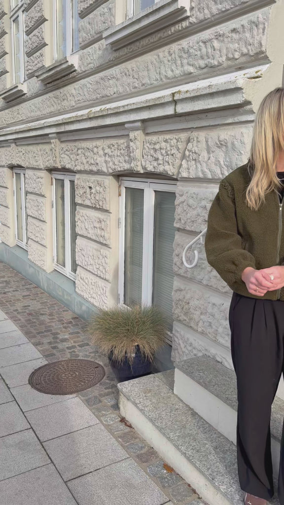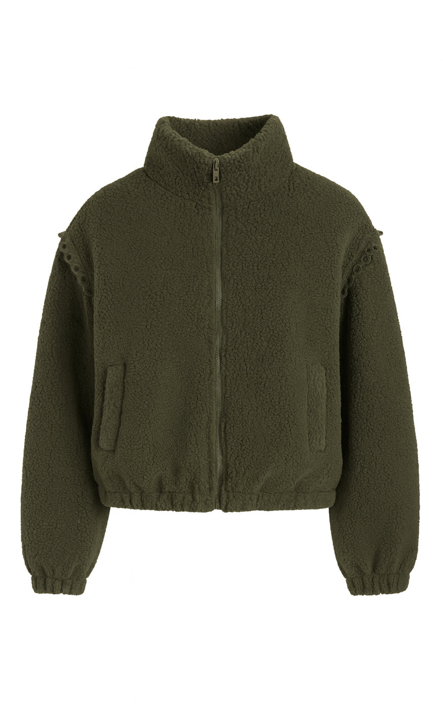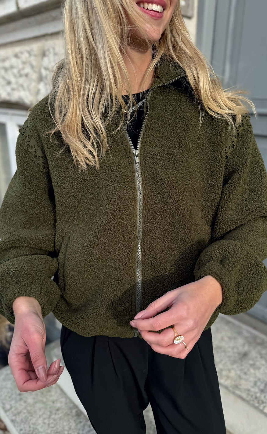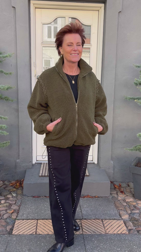 Smart fleece jakke fra Say INA Copenhagen i army grøn med den fineste blonde-kant langs begge skuldre.