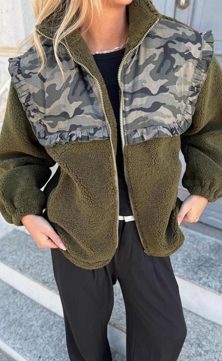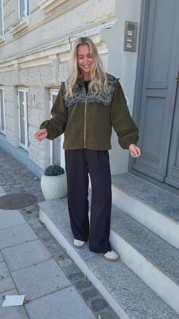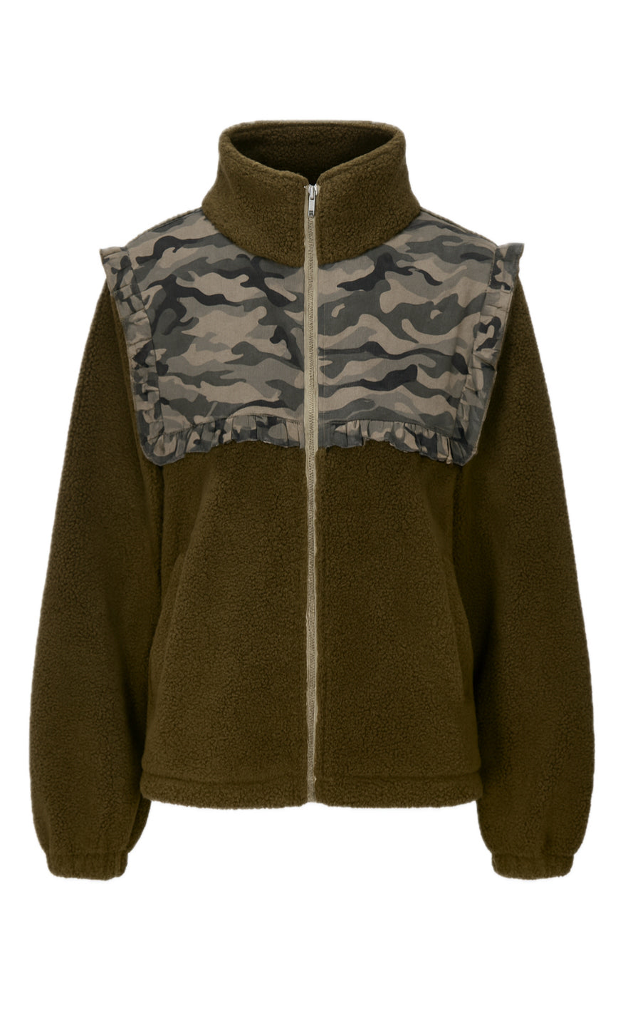 Cool fleece jakke fra Say INA Copenhagen i army grøn med camouflage print og blonder øverst på jakken både for- og bagtil.