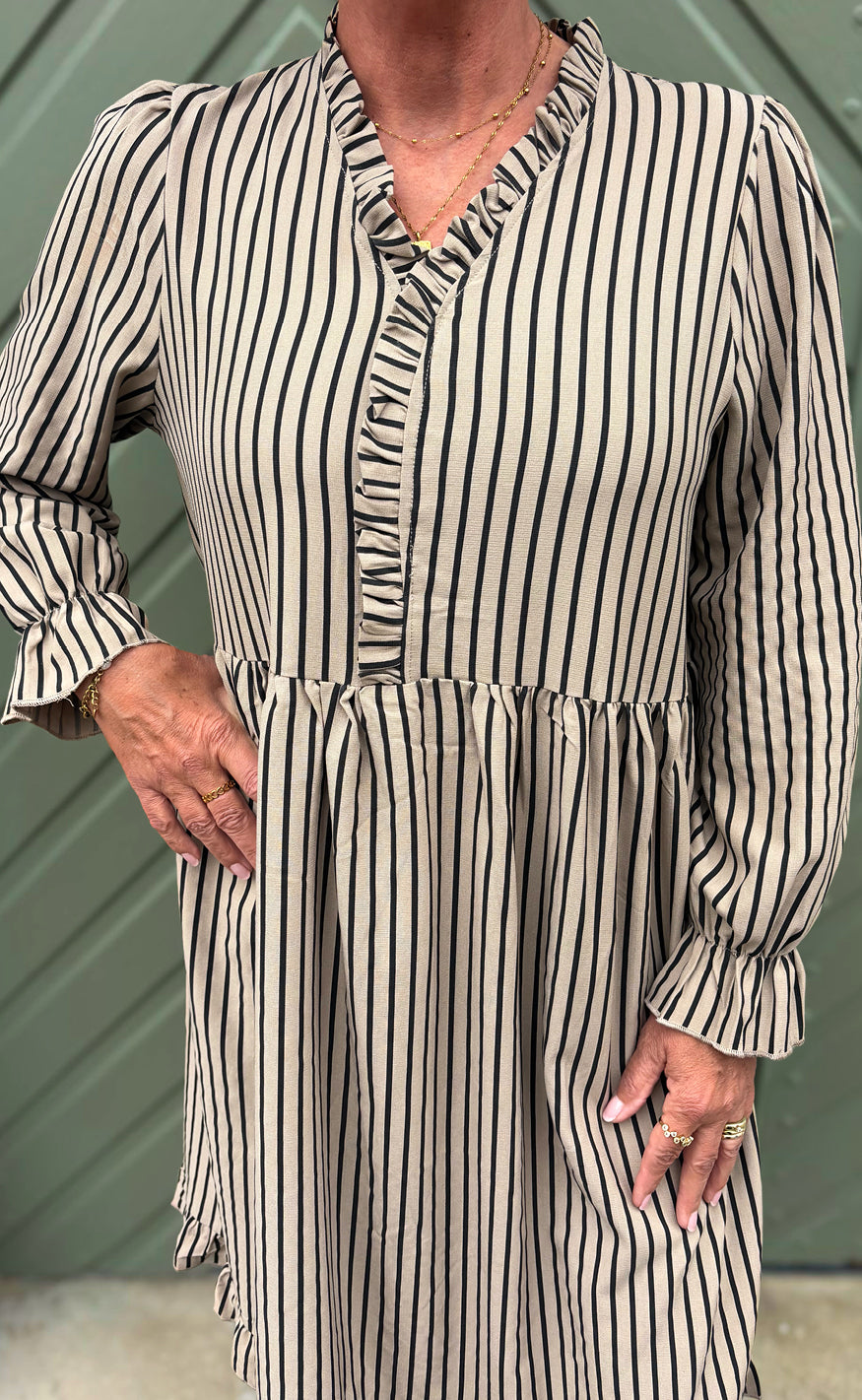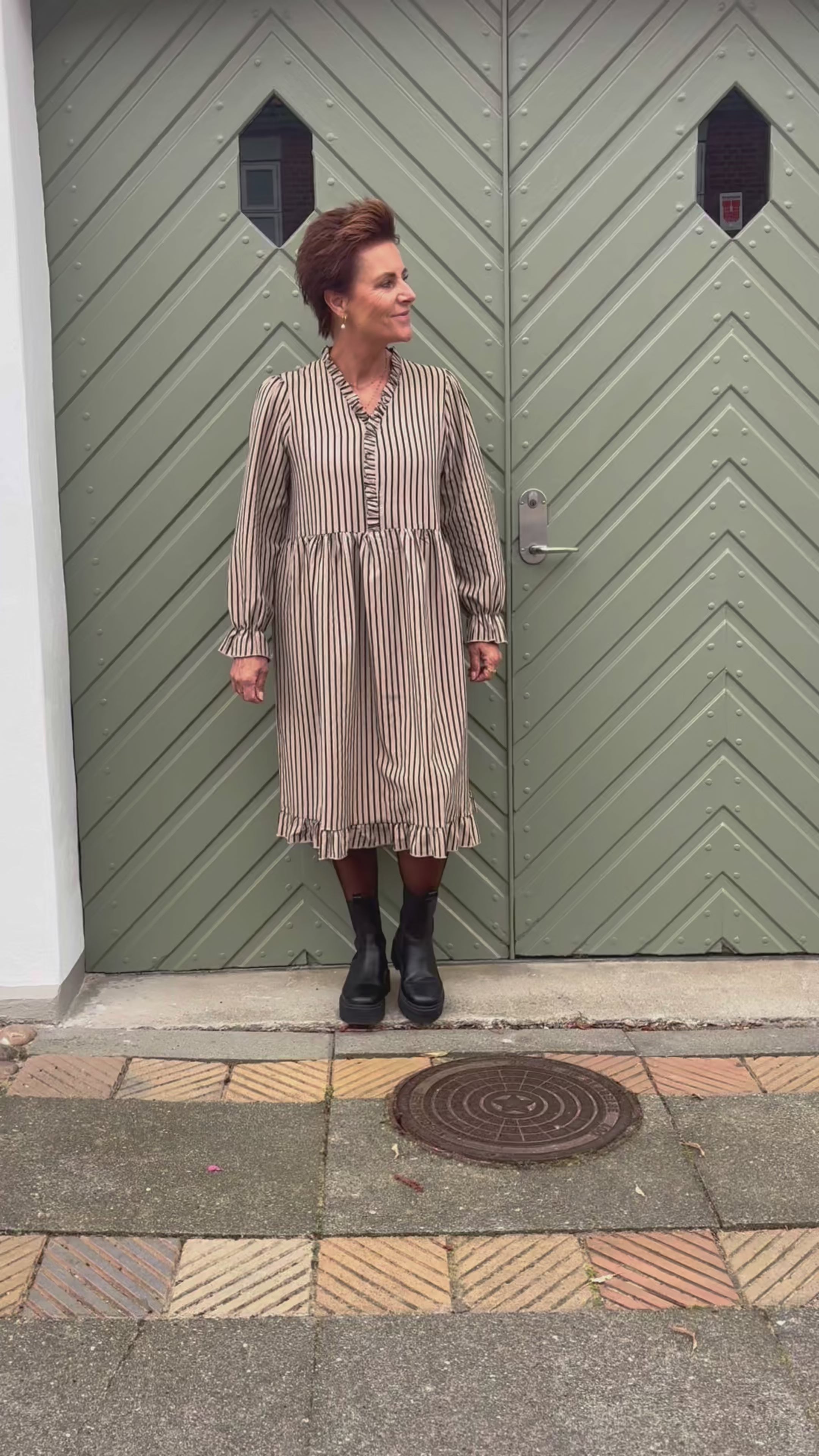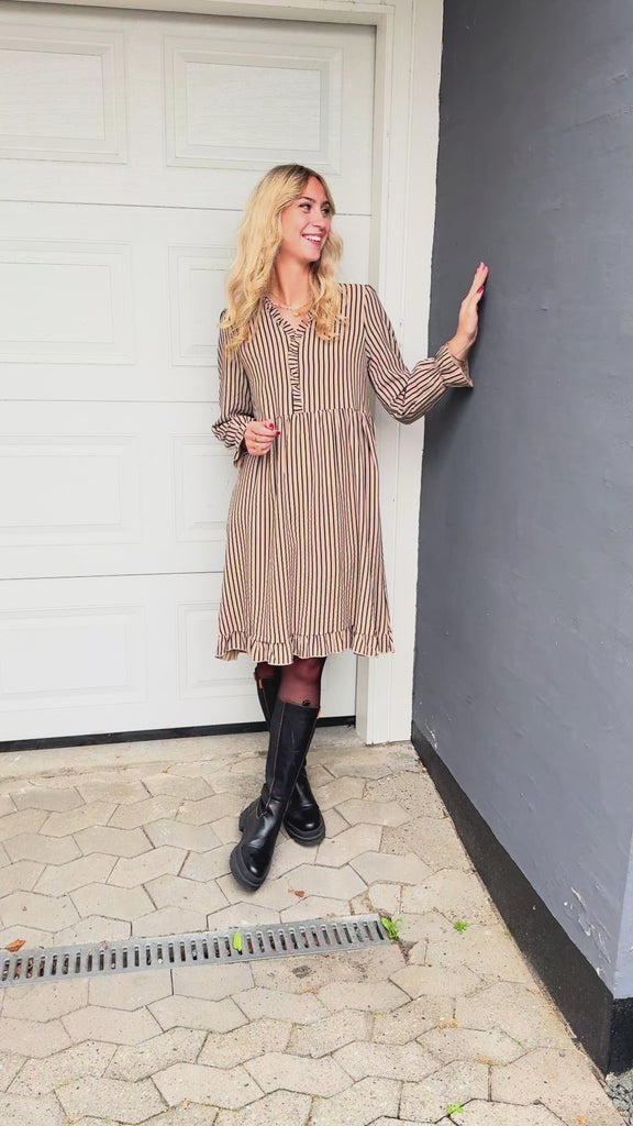 Smuk kjole fra Say INA Copenhagen i brun med sorte striber.