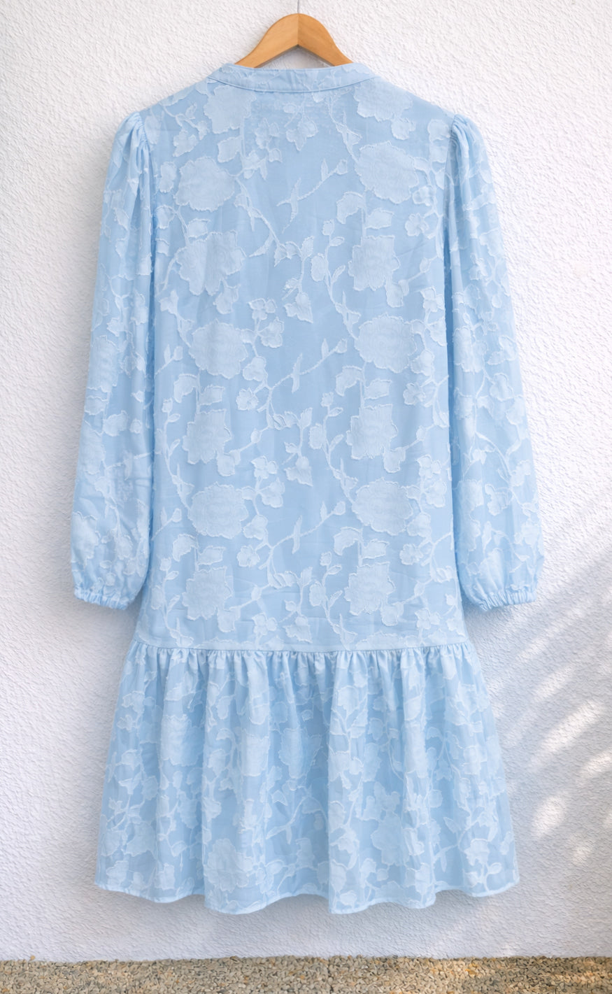 Kjolen har lange ærmer med elastik omkring håndled, en åbning med knapper og en fin overskæring i bunden af kjolen.