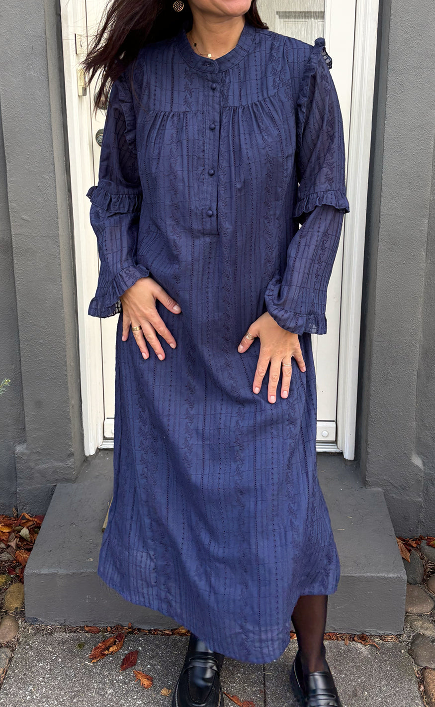 Den fineste kjole fra Say INA Copenhagen i navy blå med mange flotte detaljer.