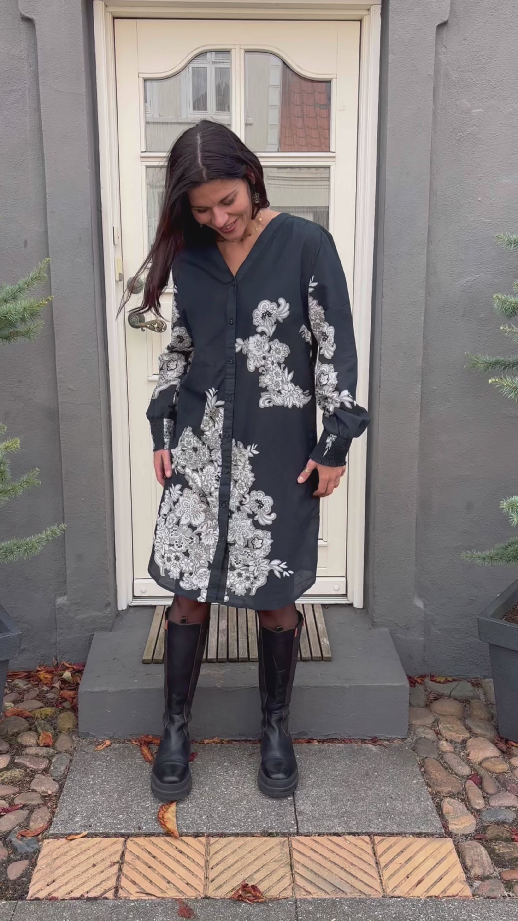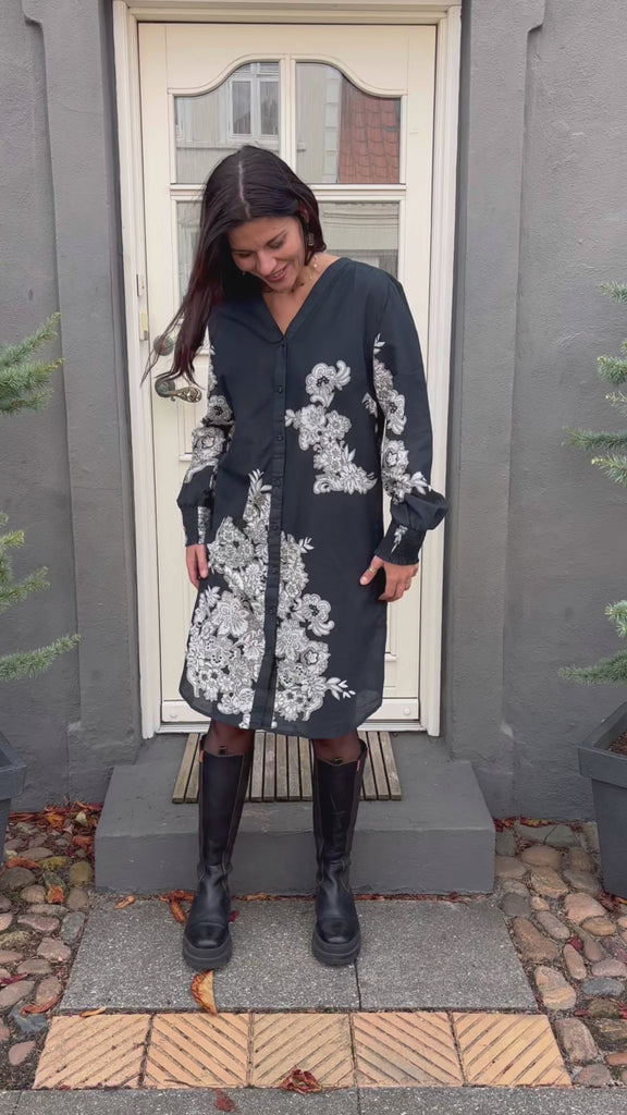 Smuk kjole fra Say INA Copenhagen i sort med blomsterprint.