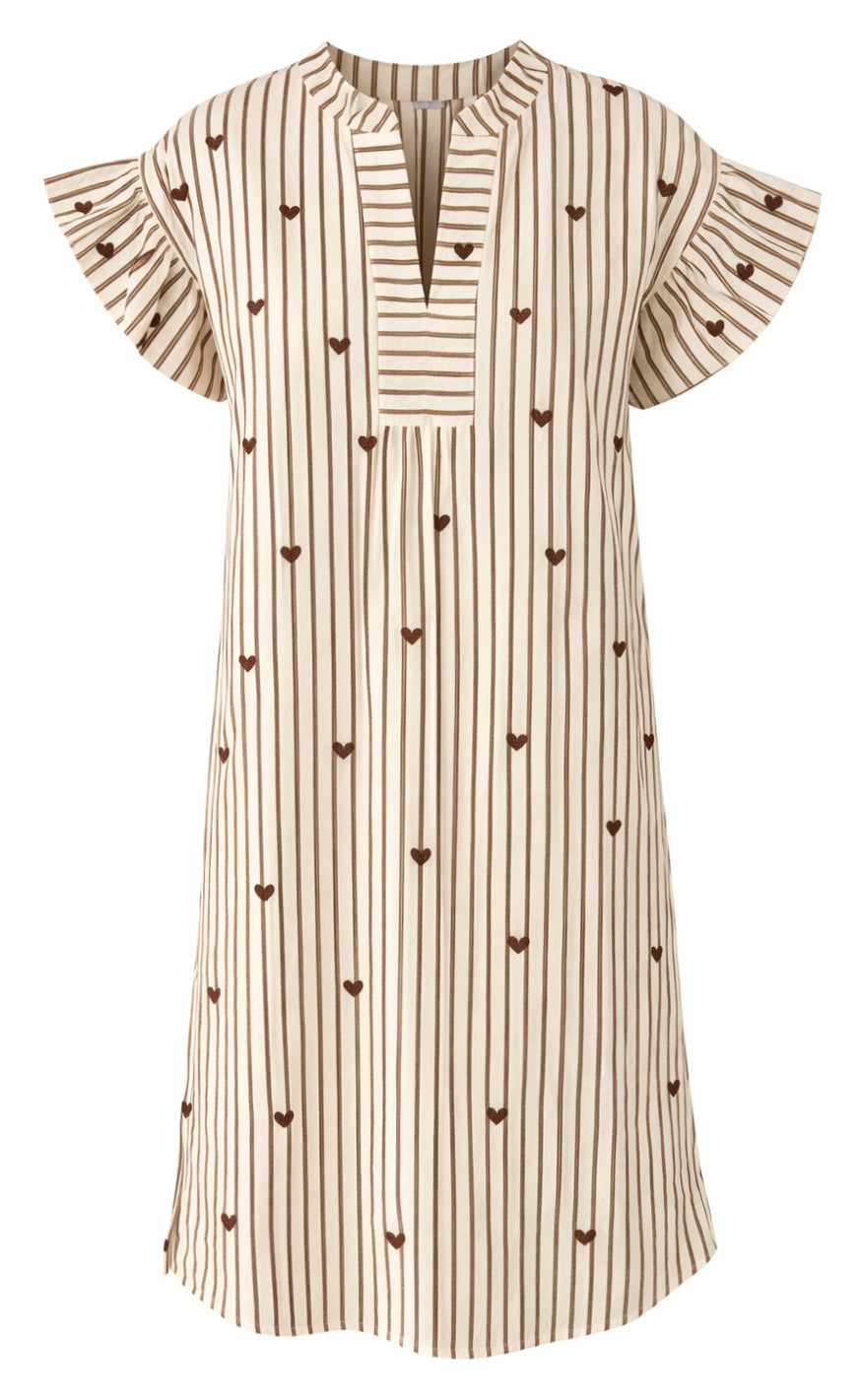Flot og frisk kjole fra INA Copenhagen i hvid-og brunstribet med broderede hjerter.