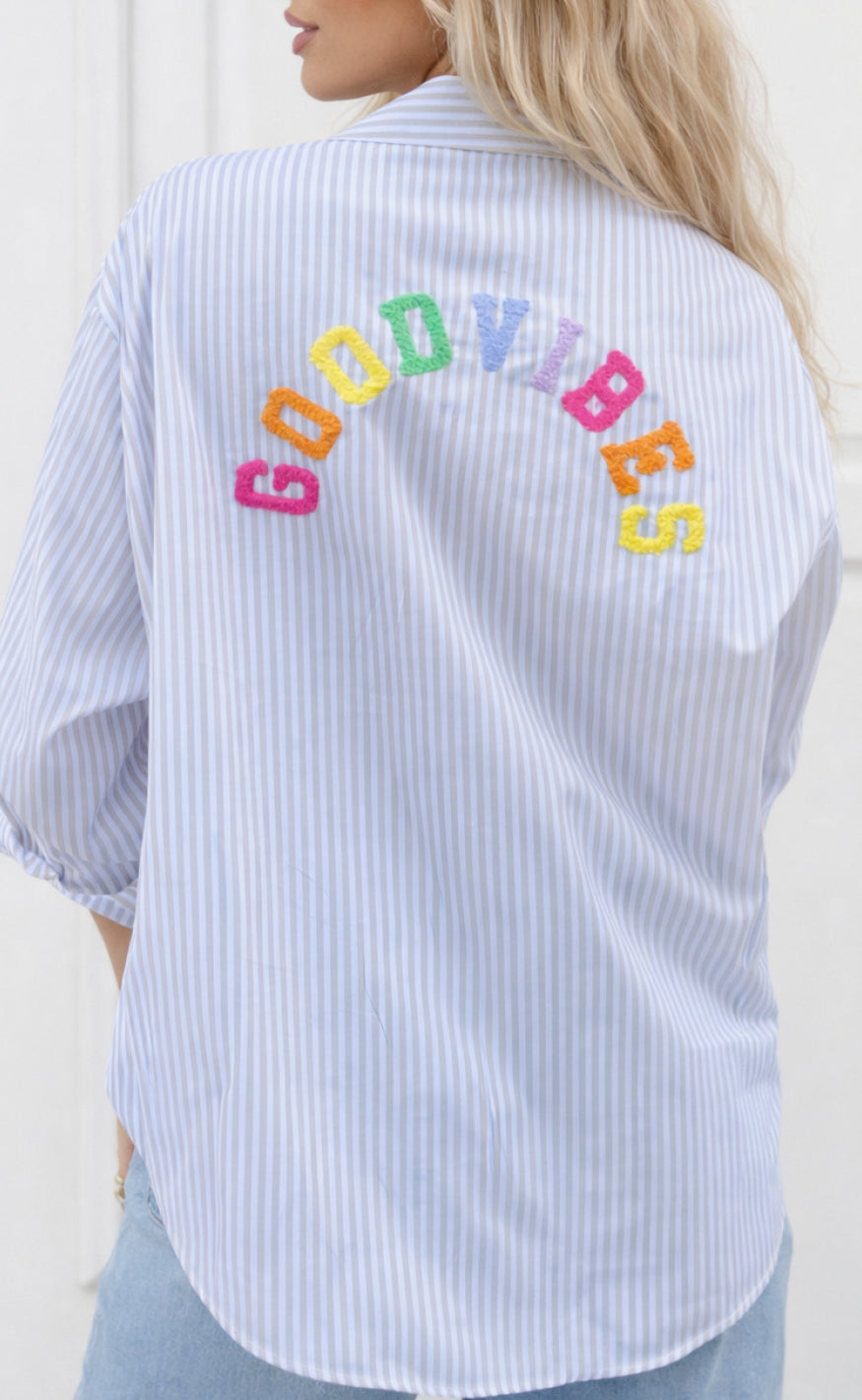 Skjorten har en broderet regnbue på brystlommen fortil og teksten 'GOOD VIBES' broderet på ryggen.
