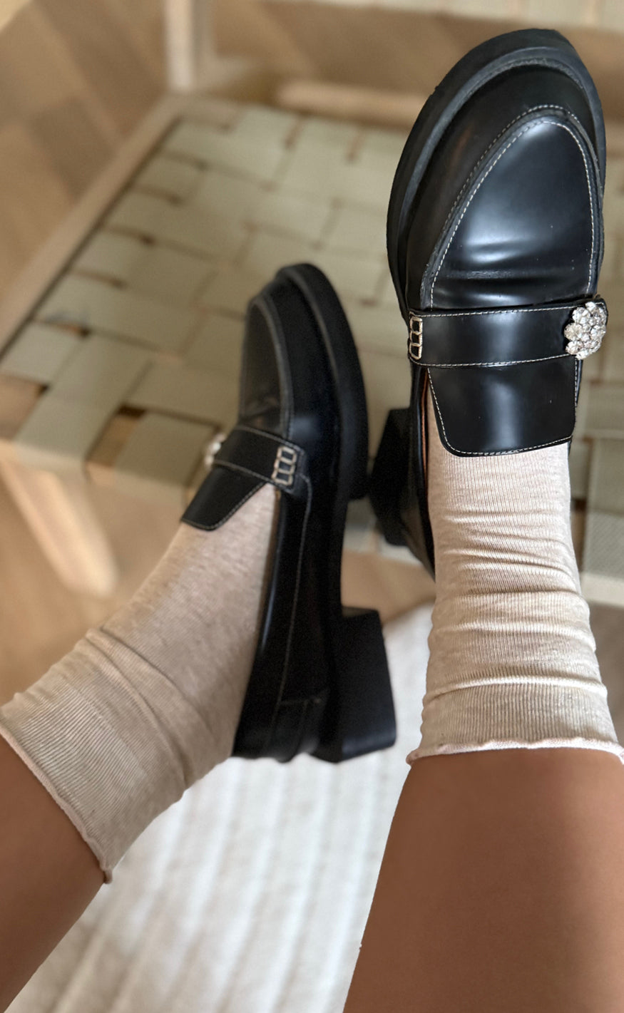 Lækre strømper fra INA Copenhagen i sandfarvet en fin flæse-kant øverst på strømperne.