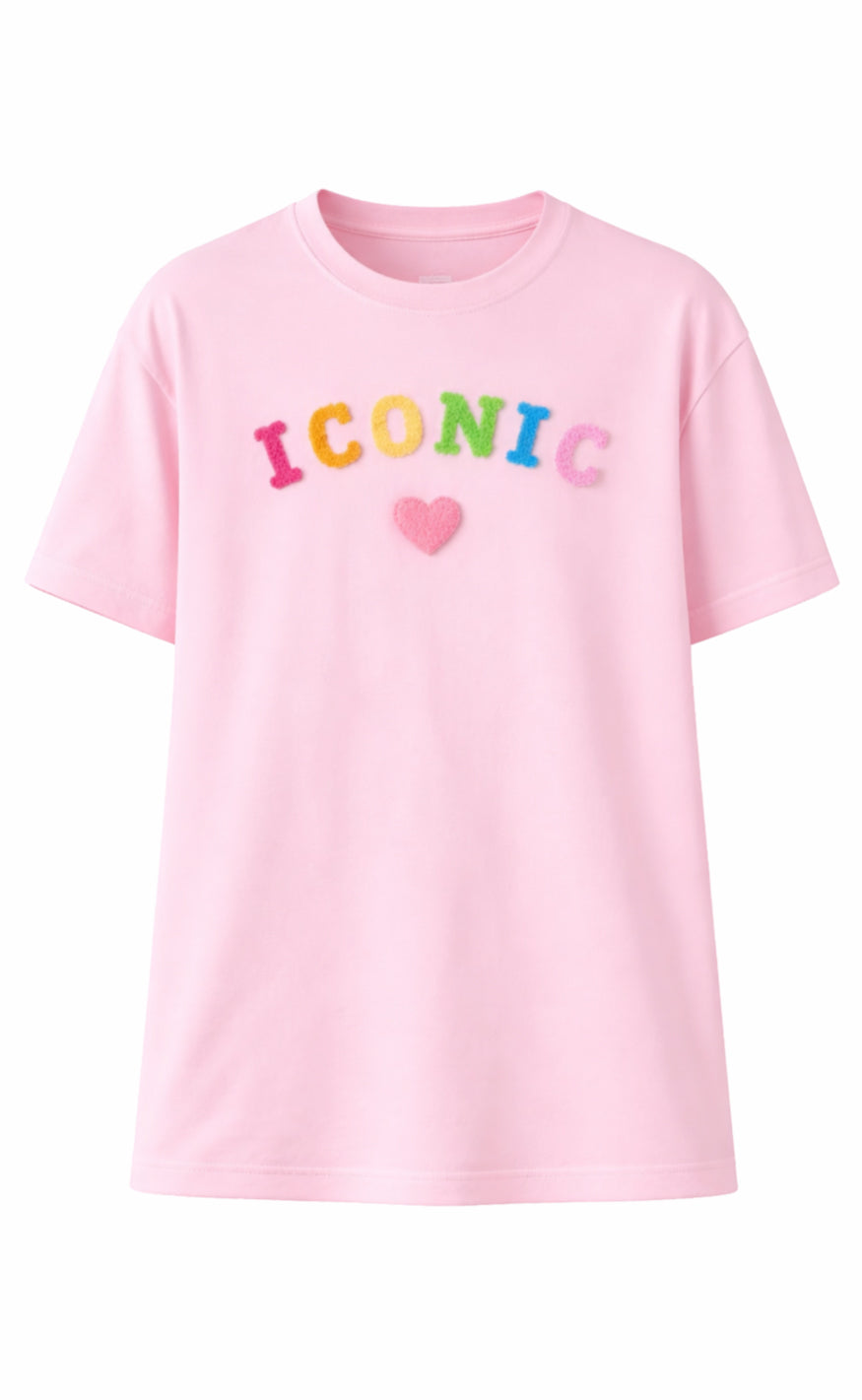 Smart T-shirt fra Say INA Copenhagen i lyserød med teksten 'ICONIC' samt et hjerte broderet på fronten i flotte farver.