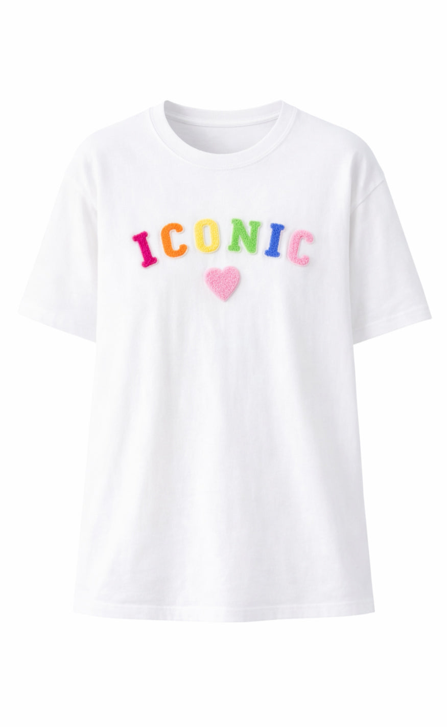 Smart T-shirt fra Say INA Copenhagen i hvid med teksten 'ICONIC' samt et hjerte broderet på fronten i flotte farver.