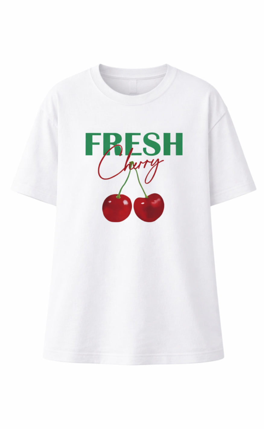Fin T-shirt fra Say INA Copenhagen i hvid med teksten 'Fresh Cherry' og kirsebær tryk.