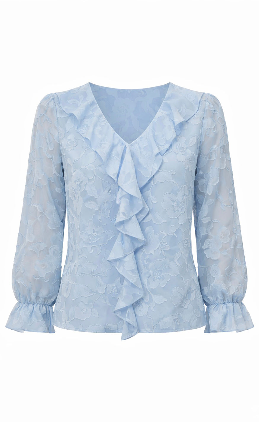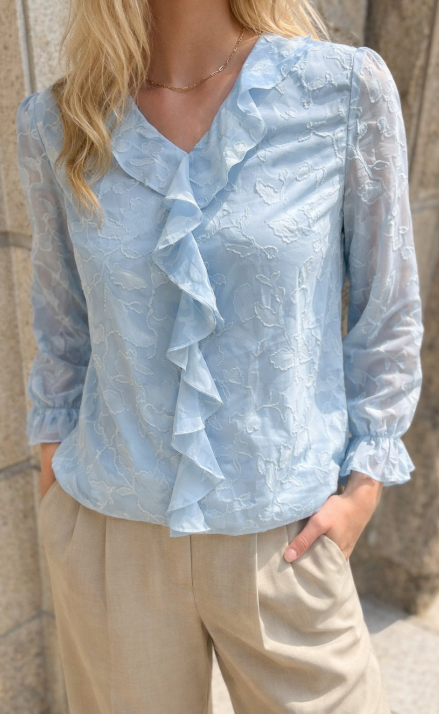Blusen har lange ærmer og de fineste detaljer med flæser ved halsen og håndled.