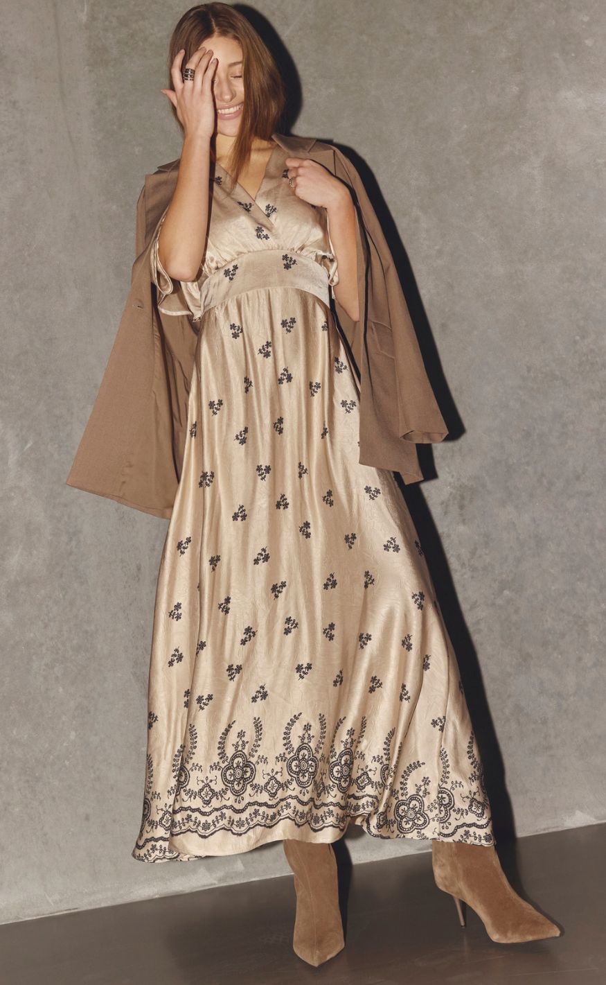 Den lange, lette pasform og det dekorative mønster langs kanten giver et romantisk udtryk – perfekt til både hverdag og særlige anledninger.