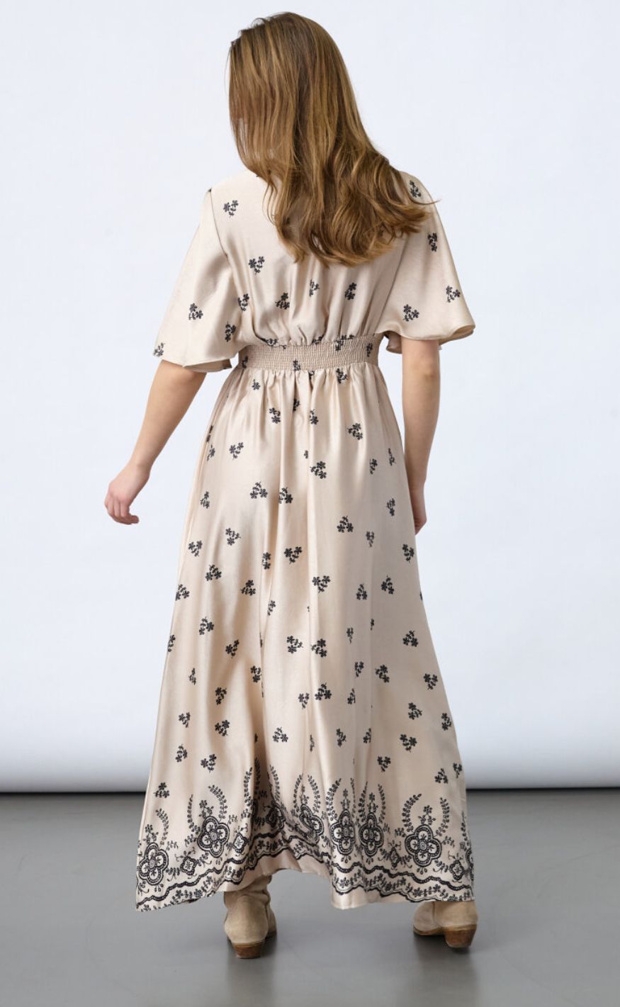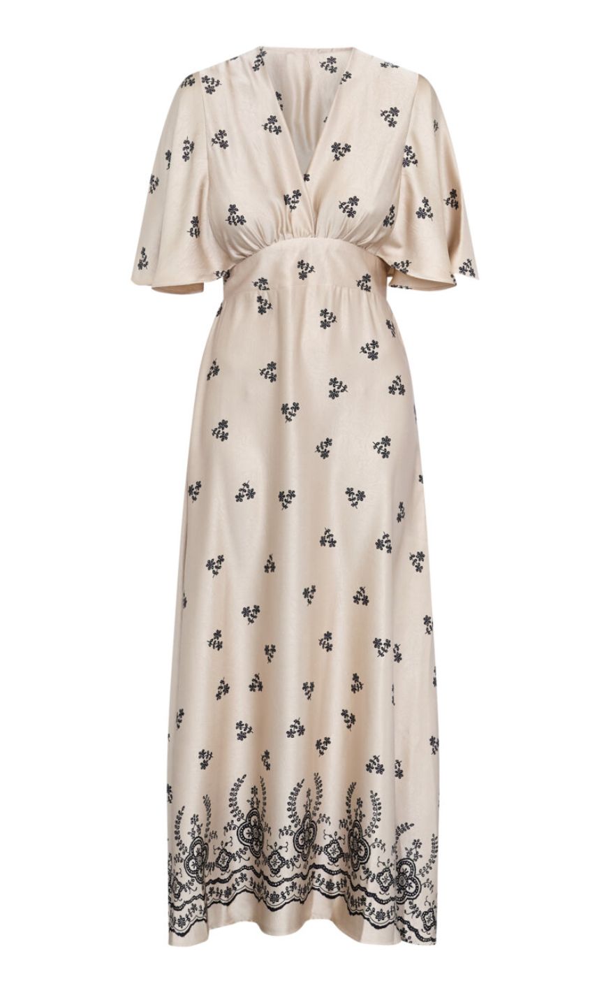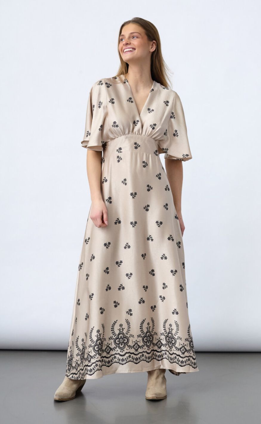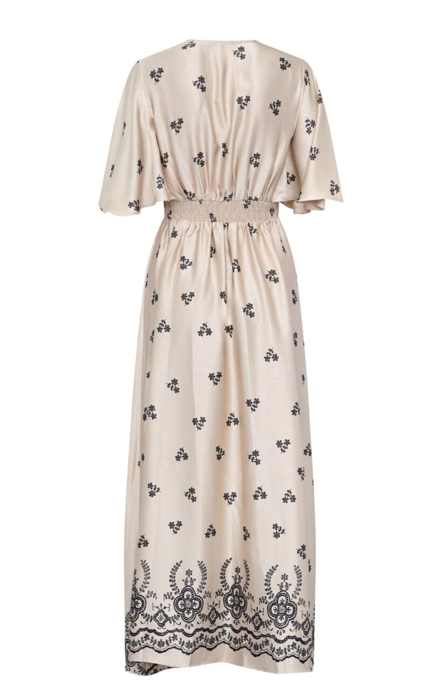 Smuk og feminin maxikjole fra Sisters Point i en blød beige nuance med fine, sorte broderidetaljer. Kjolen har V-udskæring, korte, løse ærmer og markeret talje, der skaber en elegant og flatterende silhuet.