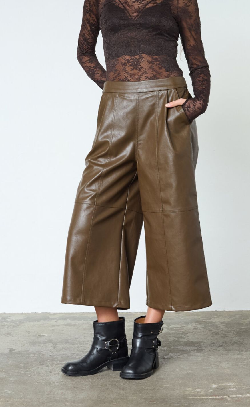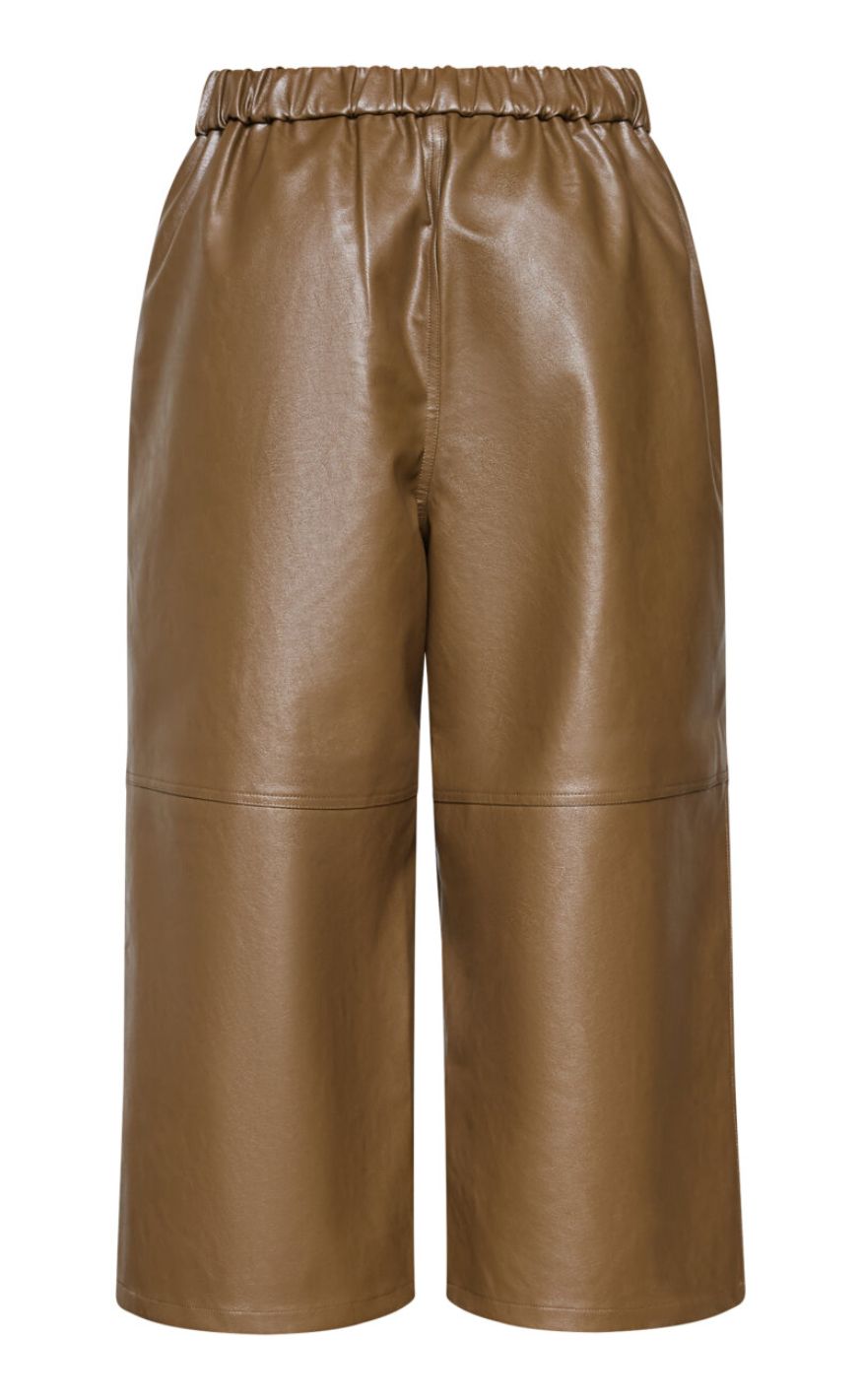 Moderne culotte-bukser fra Sisters Point i et stilrent læderlook i en varm brun nuance. Bukserne har elastik i taljen og en croppet længde med vidde i benene, som skaber et trendy og elegant udtryk.