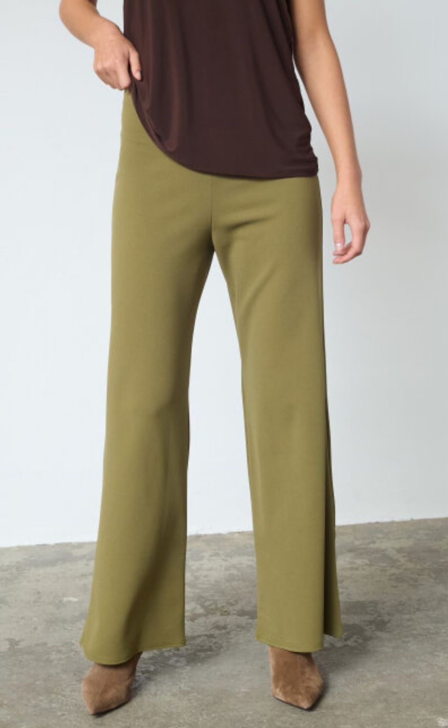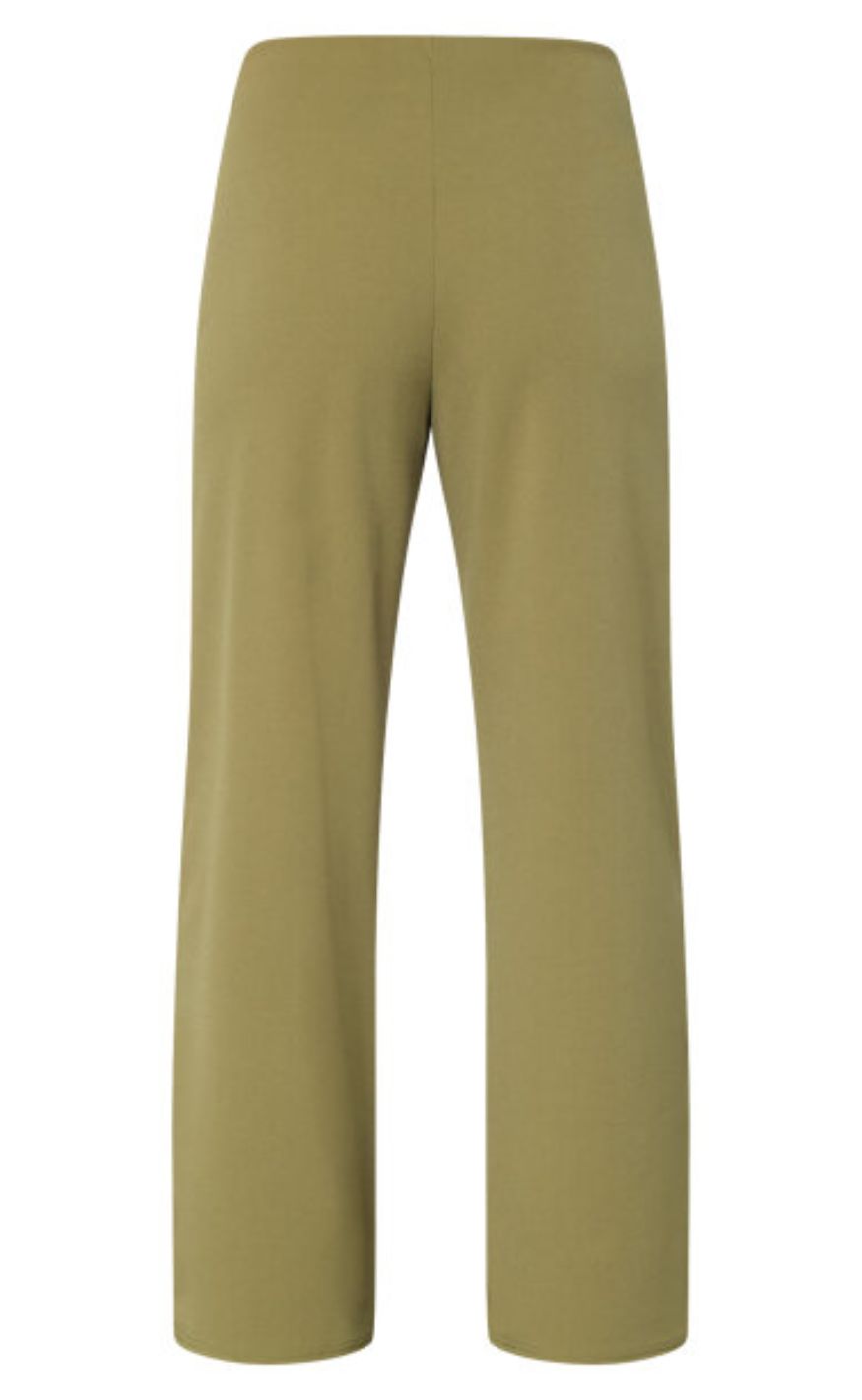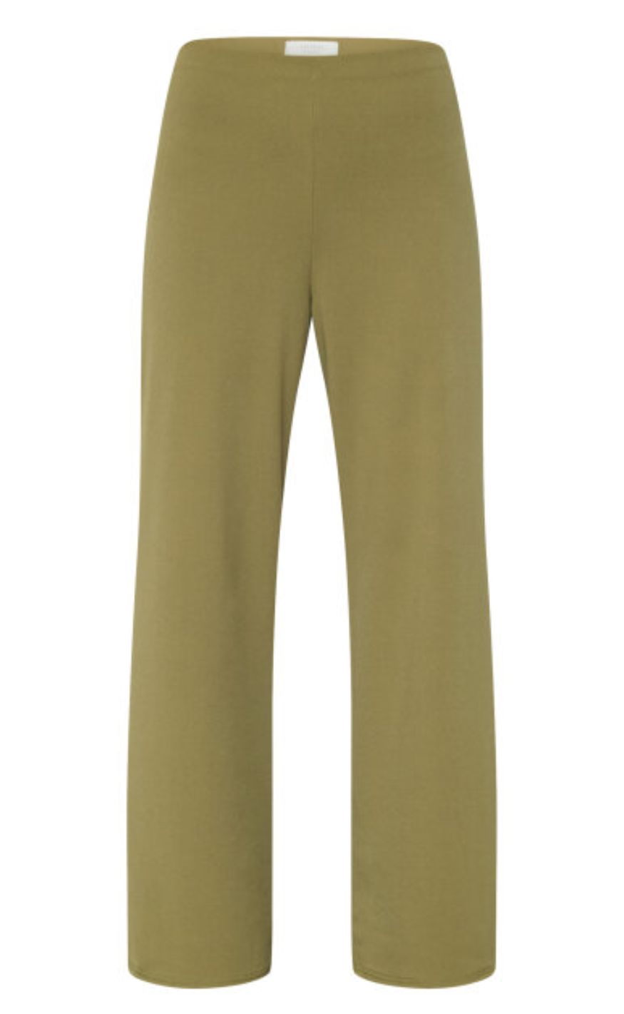 Ensfarvede lange bukser i en grøn nuance med brede ben og en høj talje med elastik.