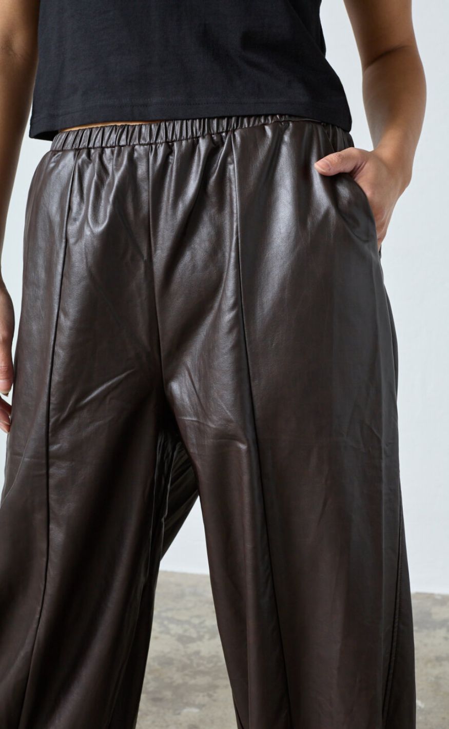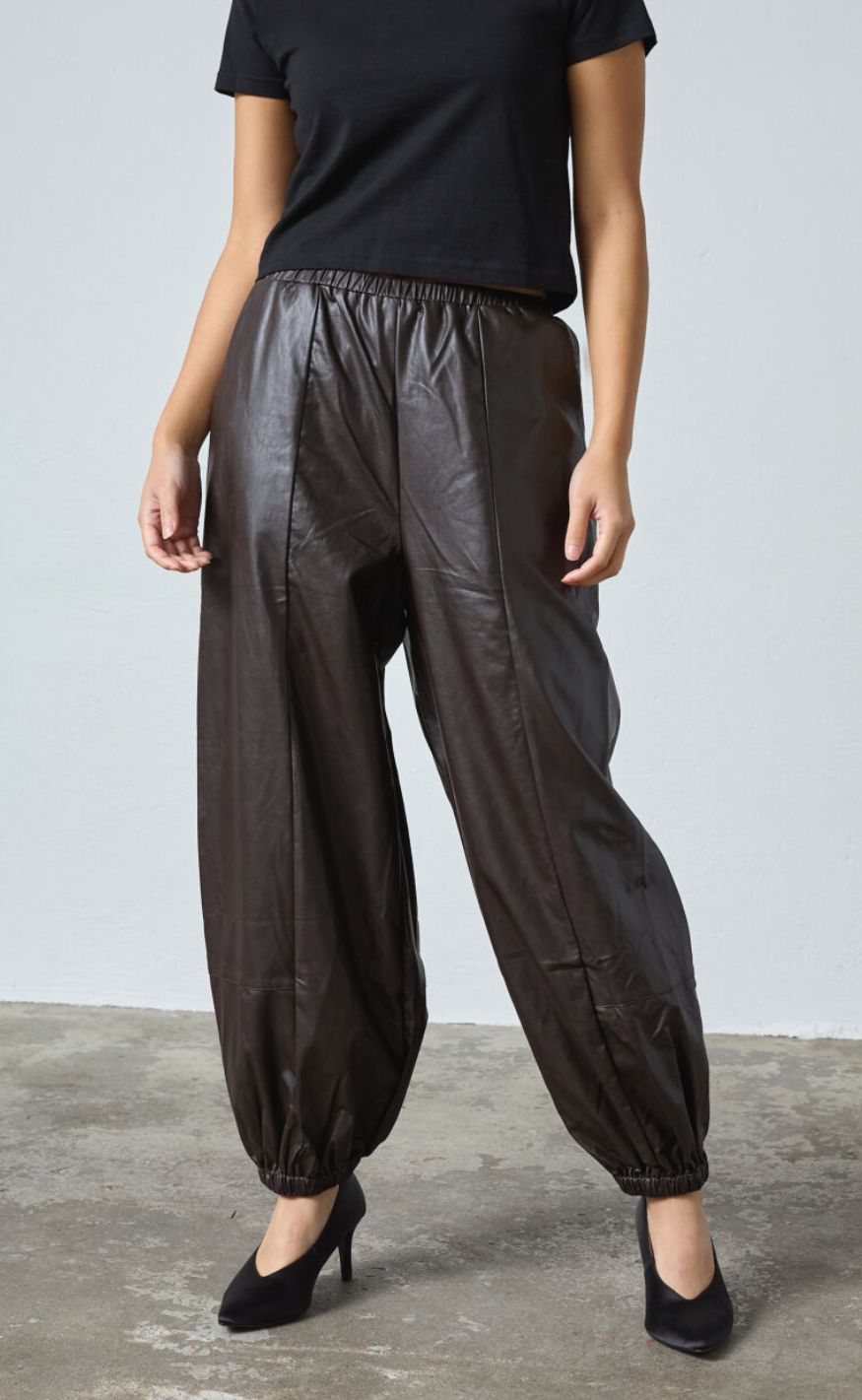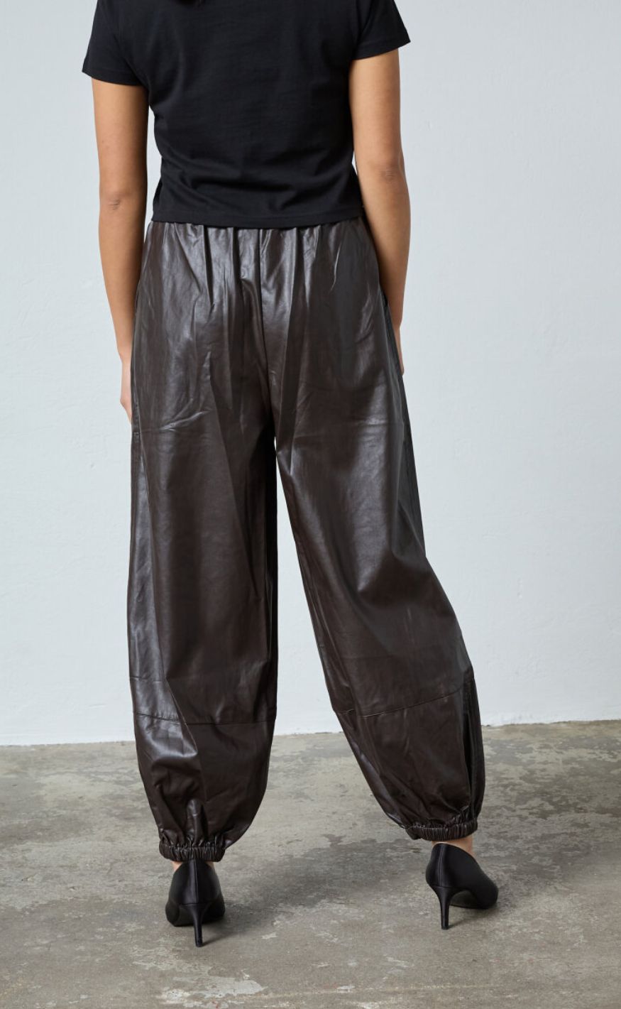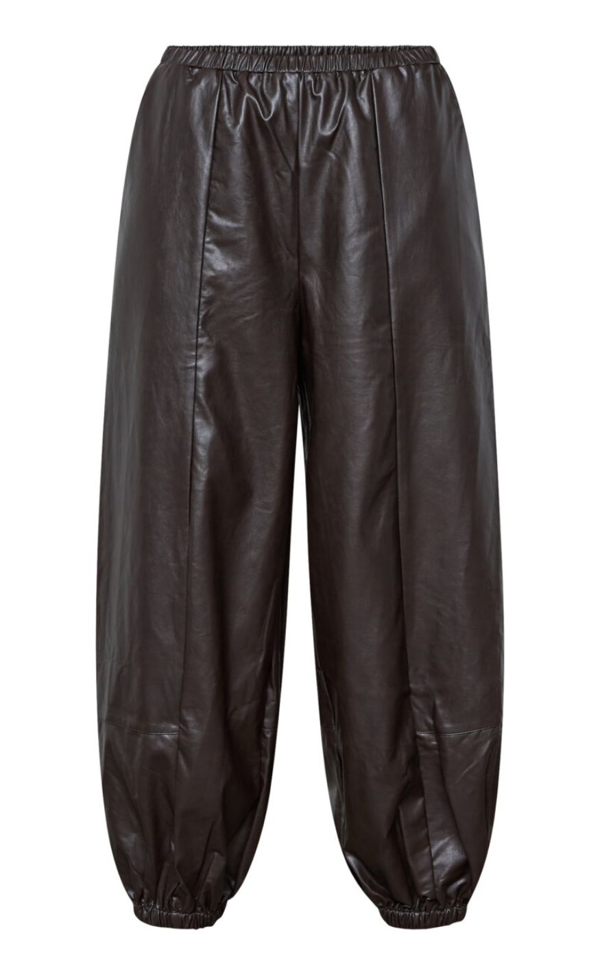 Moderne bukser fra Sisters Point i et cool læderlook i en dyb brun nuance. Bukserne har elastik i taljen samt elastik ved anklerne, der giver en trendy ballon-effekt og et afslappet, men stilfuldt udtryk.