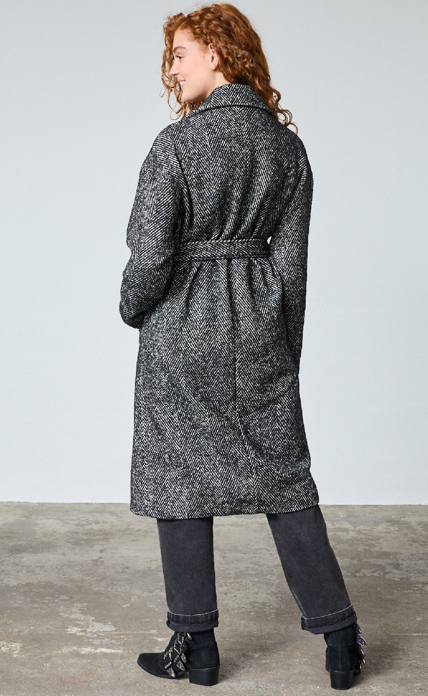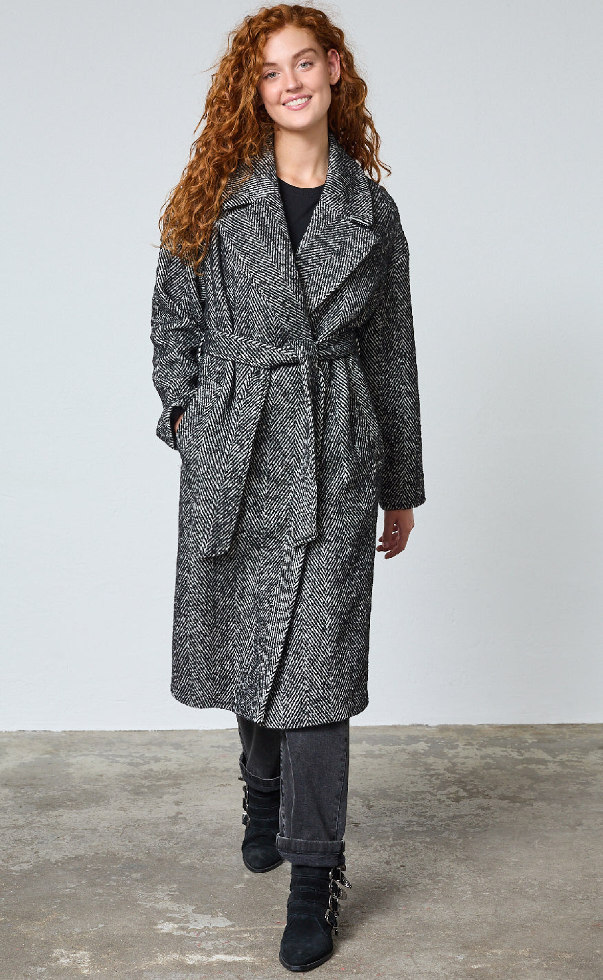 Frakken har lange ærmer, bred revers og bindebælte i taljen, der giver et elegant og tidløst look.