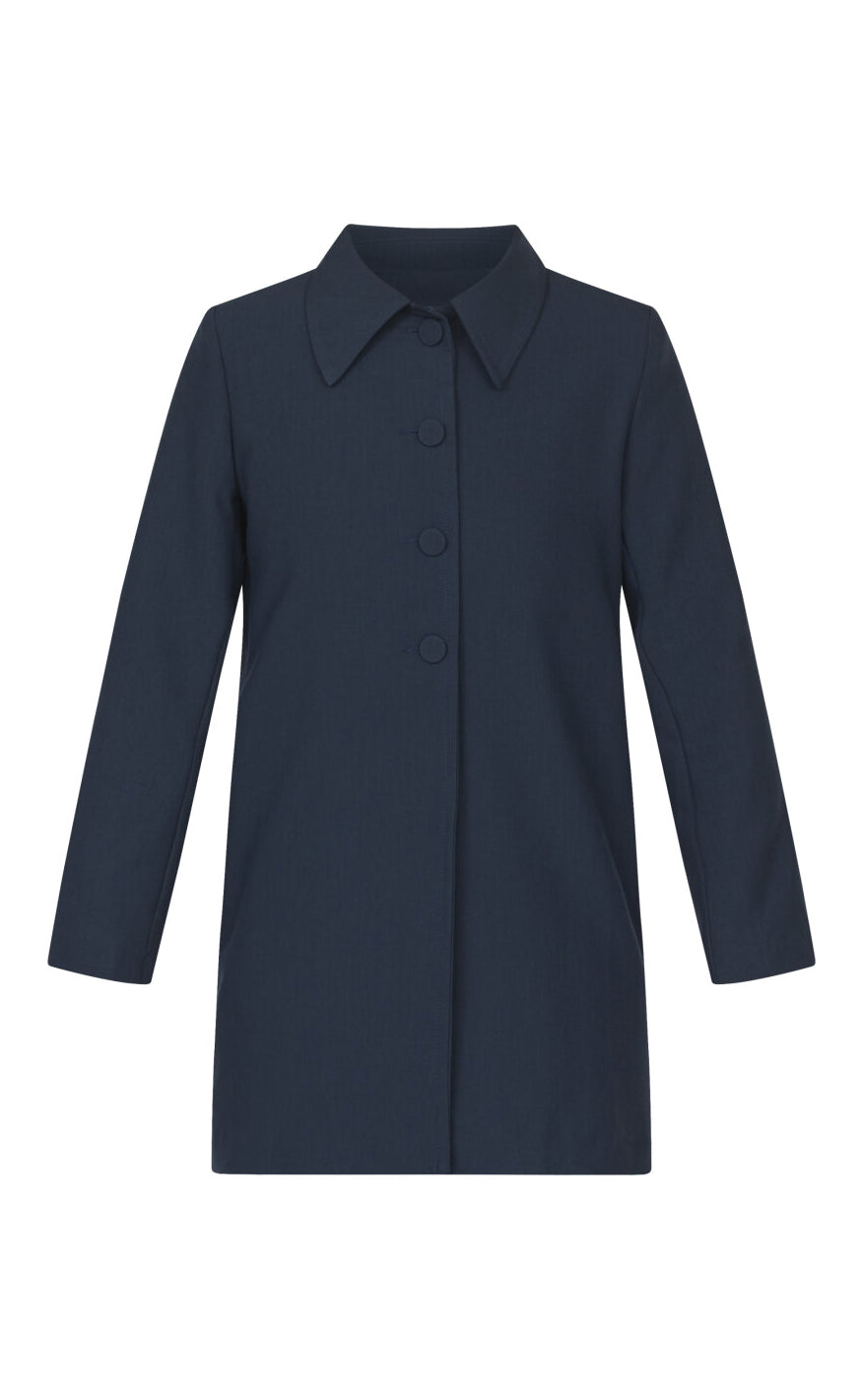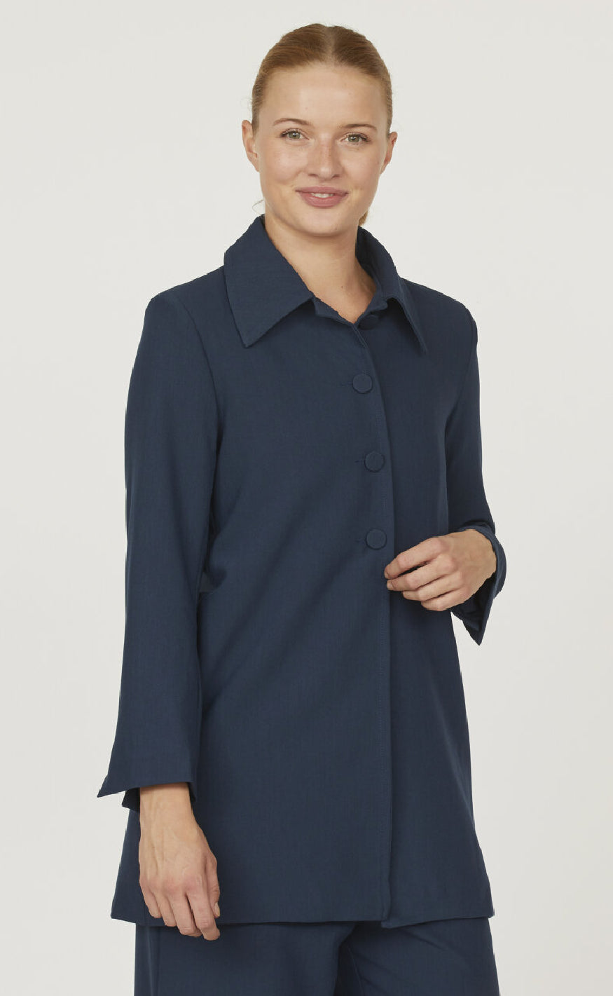 Jakken har lange ærmer, krave og en gennemgående knaplukning foran, hvilket giver et elegant og tidløst look.