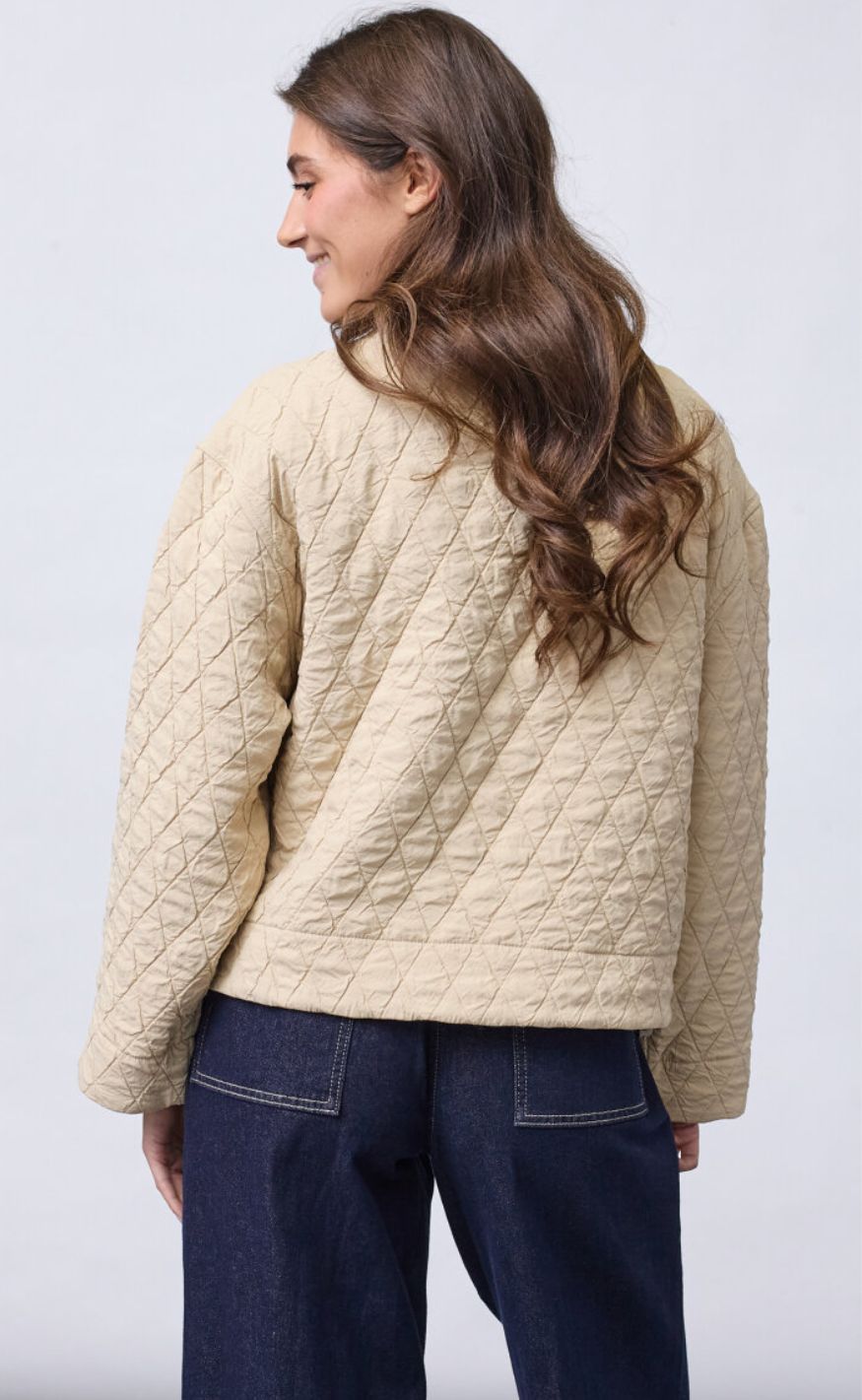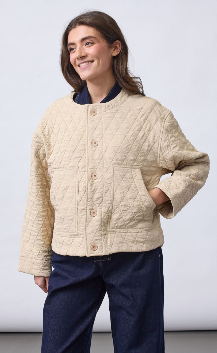 Den løse pasform og lette vattering gør den perfekt som overgangsjakke, der nemt kan styles over både strik, skjorte eller kjole.