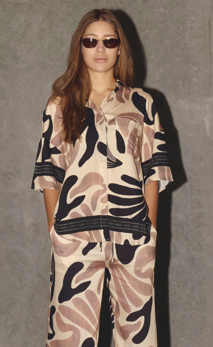 Den løse pasform og det lette materiale sikrer et smukt fald, mens brystlommen og de dekorative detaljer forneden fuldender looket – perfekt stylet alene eller som del af et matchende sæt.