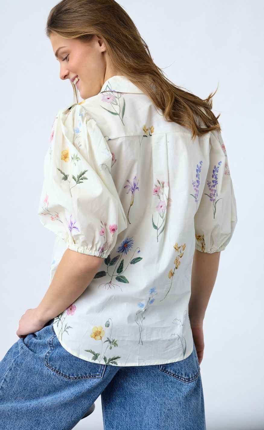Feminin og elegant skjorte fra Sisters Point i en lys cremefarve med smukt blomsterprint. Skjorten har klassisk krave, gennemknapning og korte, voluminøse ærmer med elastisk afslutning, der giver et romantisk og moderne udtryk.