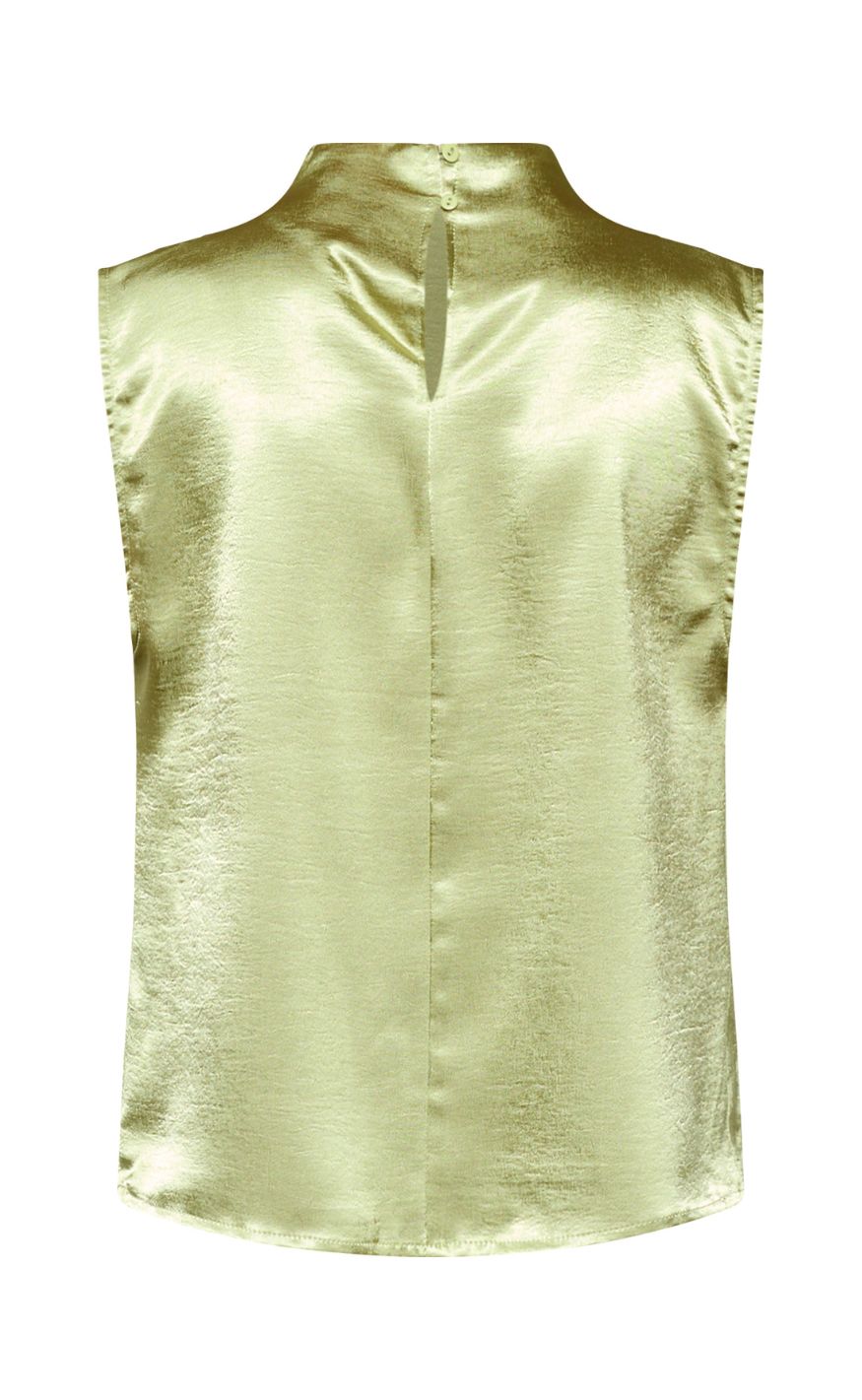 Ærmeløs top i skinnende satin med høj hals og let markerede skuldre. Stoffet falder flot og giver et elegant udtryk, og den lukkes diskret i nakken.