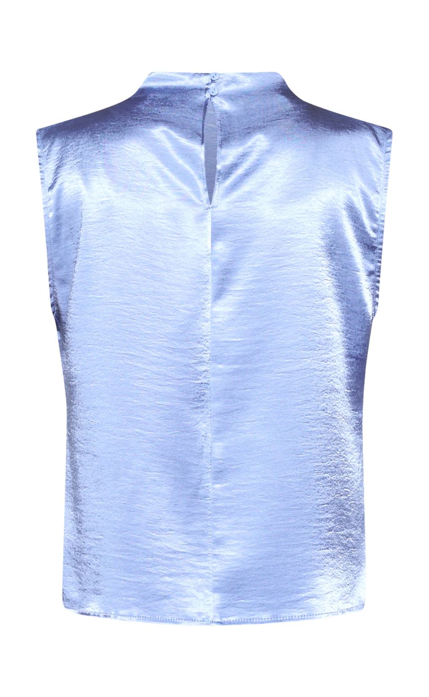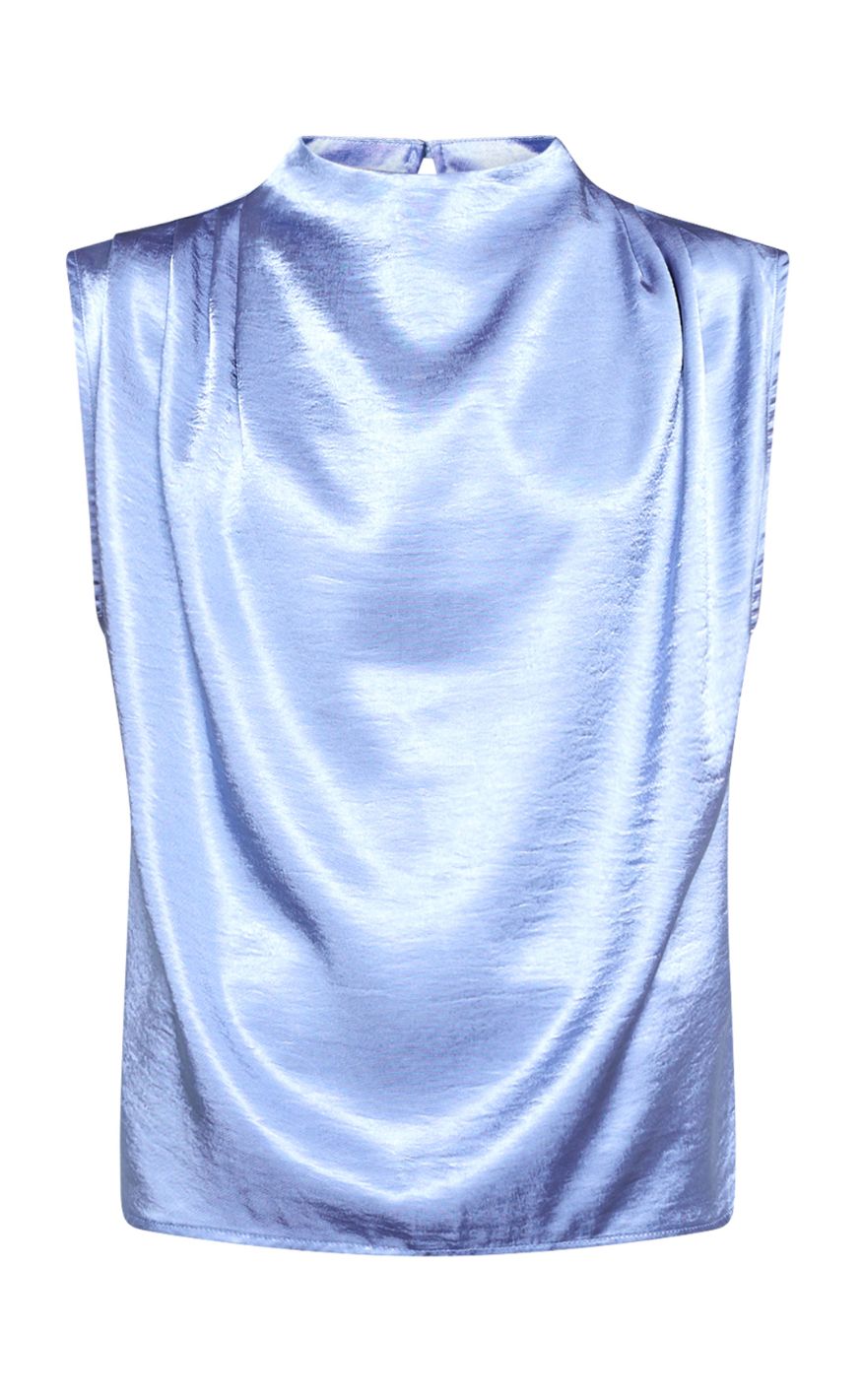 Ærmeløs top i skinnende satin med høj hals og let markerede skuldre. Stoffet falder flot og giver et elegant udtryk, og den lukkes diskret i nakken.