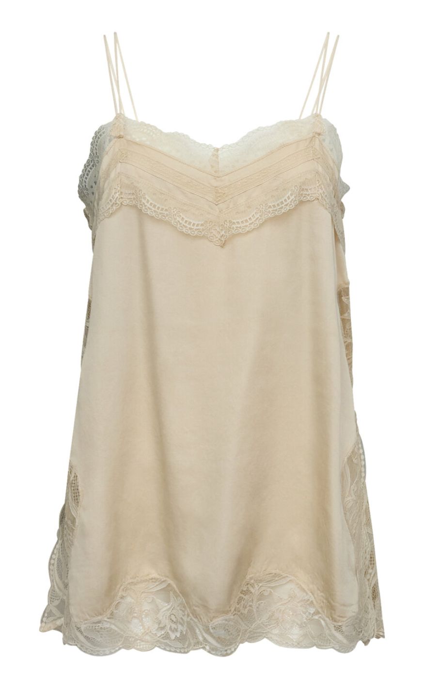 Feminin og elegant top fra Sisters Point i en smuk, lys nuance med fine blondedetaljer. Toppen har smalle stropper og en flatterende V-udskæring med dekorativ blondekant, der giver et romantisk og eksklusivt udtryk.