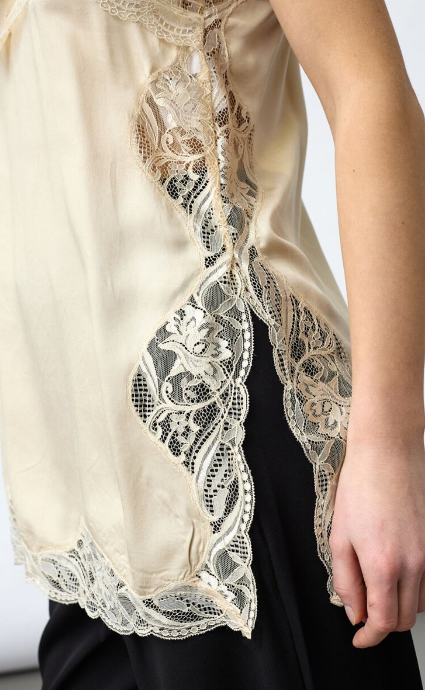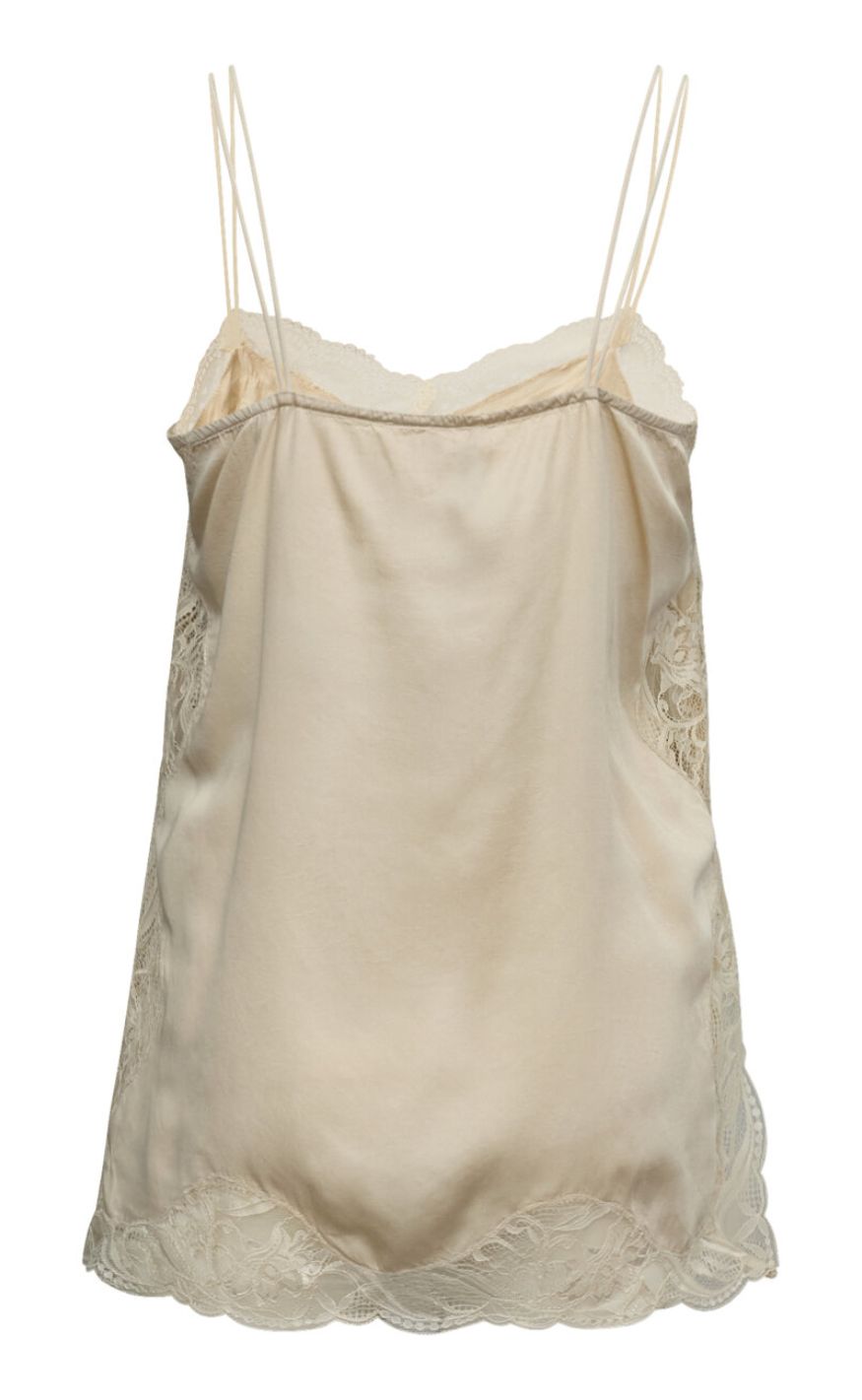 Den lette, bløde kvalitet og den løse pasform gør den behagelig at have på, mens blondedetaljerne tilfører et sofistikeret touch – perfekt både alene eller under en blazer eller strik.