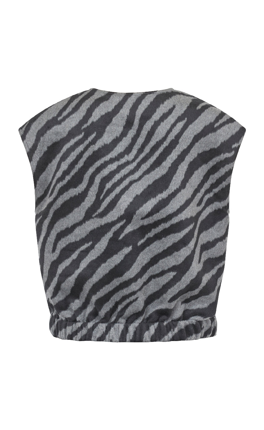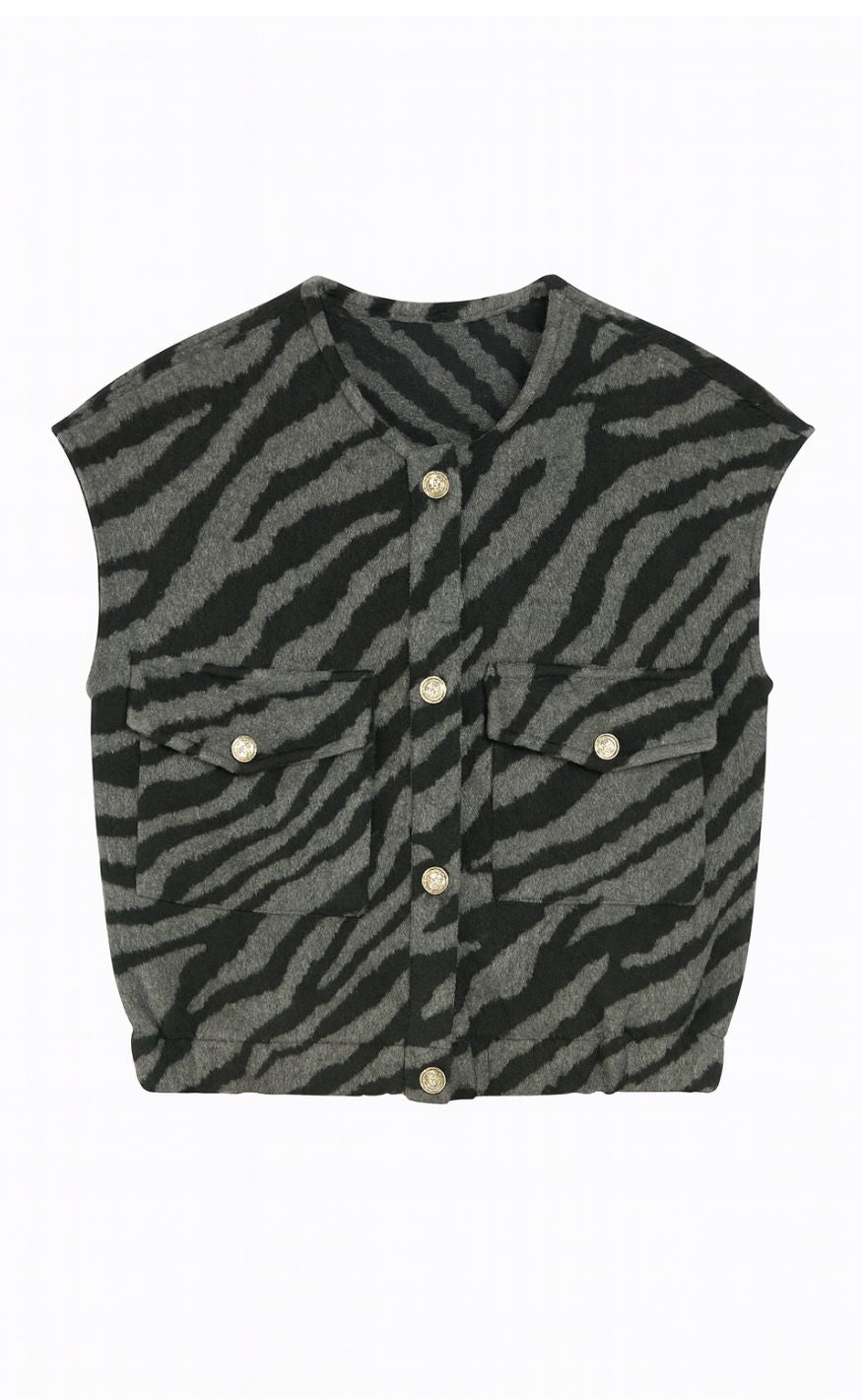 Grå vest med zebramønster, rund hals og knaplukning foran, designet med to frontlommer og elastisk kant forneden for en moderne og struktureret pasform.