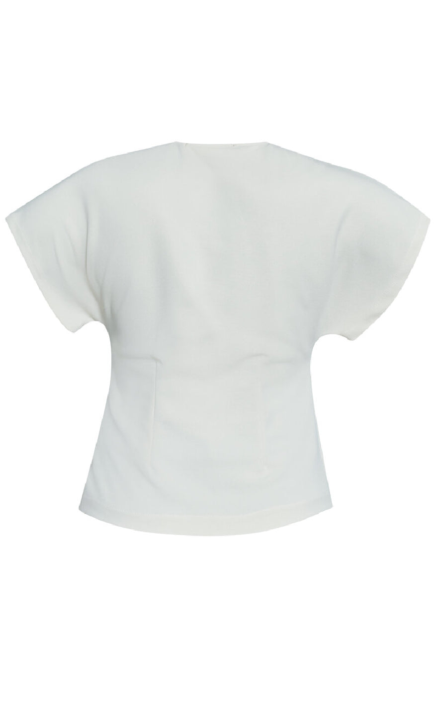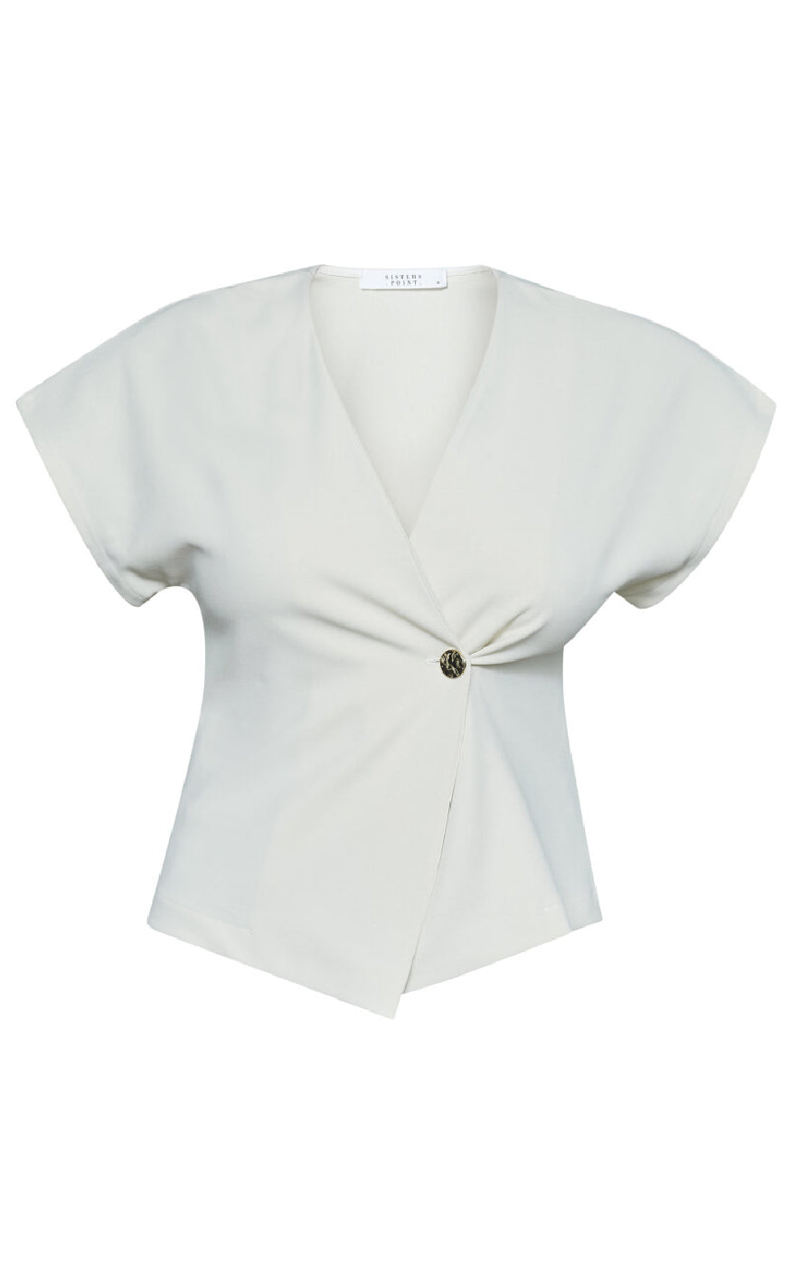 Vesten har en dyb v-udskæring og en asymmetrisk lukning i siden med en enkelt guldknap.
