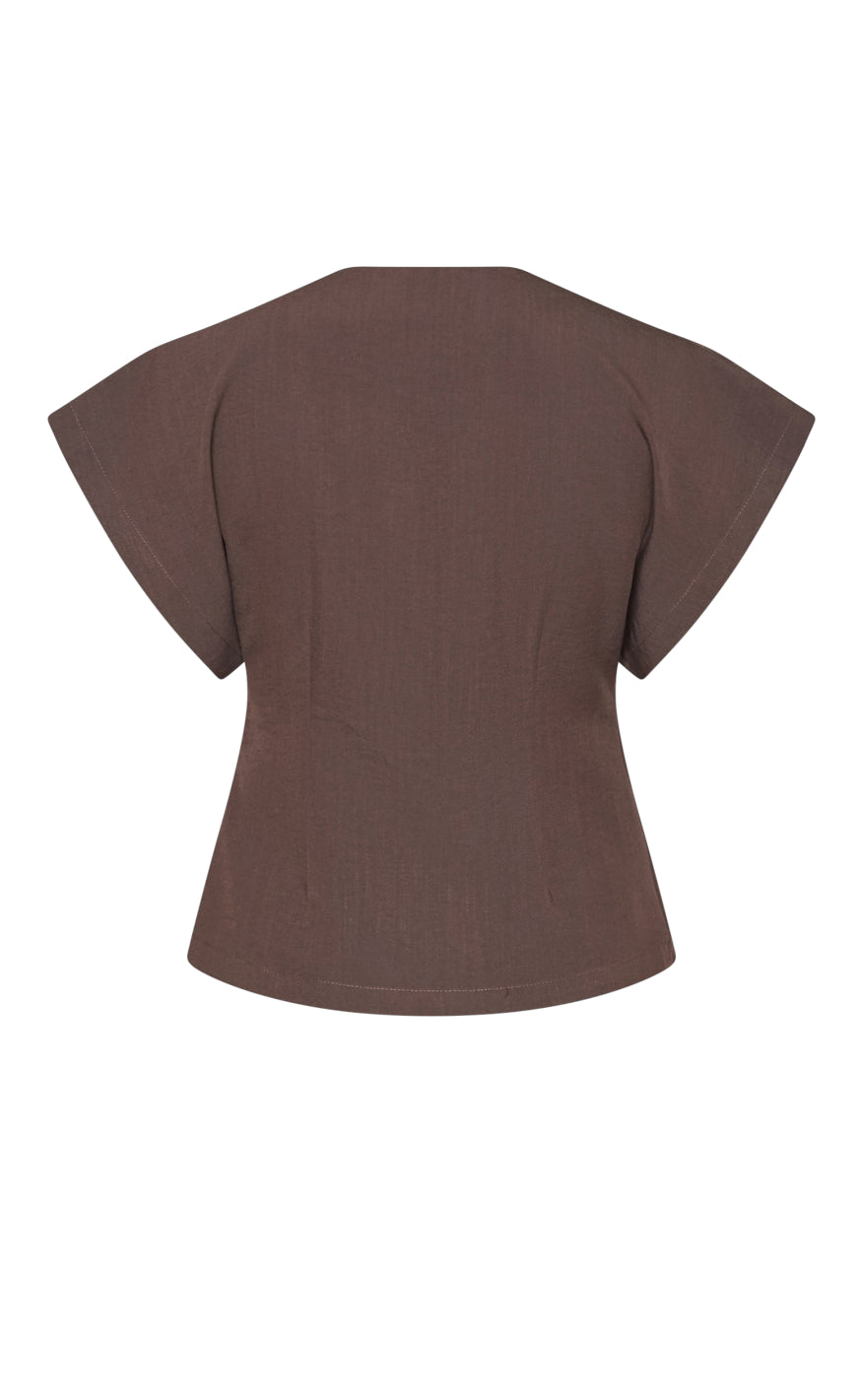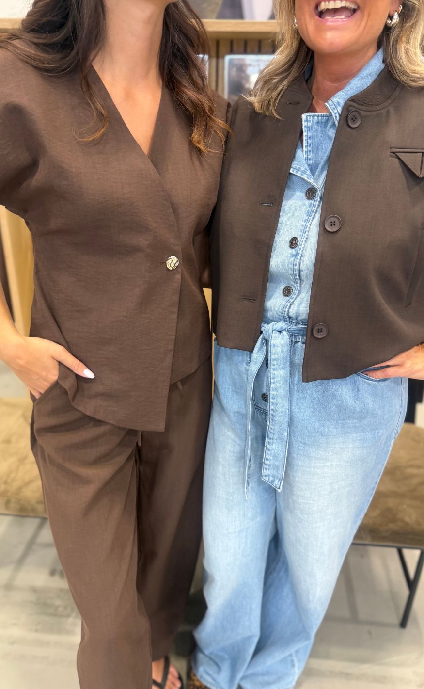 Vesten har en dyb v-udskæring og en asymmetrisk lukning i siden med en enkelt guldknap.