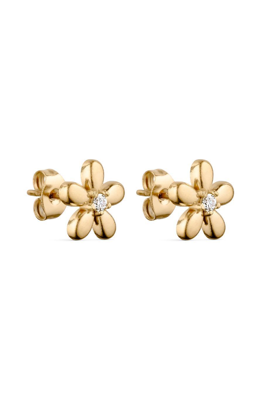 Fine studs fra Smykkeli Copenhagen i guld formet som en blomst med en lille zirconia sten i midten.